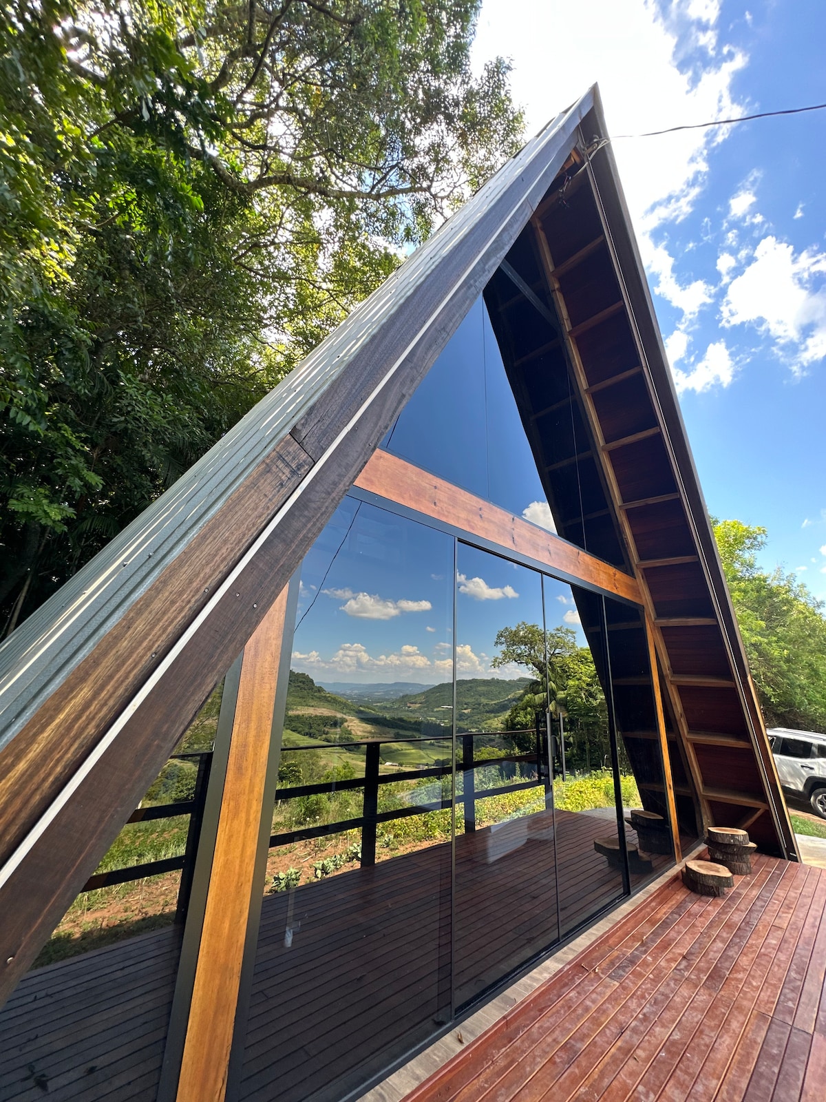 No alto de um morro, a Cabana Seibel é um refúgio A-Frame com frente totalmente em vidro, imersa na natureza e com vista de tirar o fôlego para as montanhas e a comunidade local! Elegância e aconchego em cada detalhe, com hidromassagem, Wi-Fi, ambiente climatizado, cozinha completa, quiosque na mata, e espaço externo privativo com fogo de chão. Aqui, o tempo desacelera e você cria memórias inesquecíveis! 📍Localizada em Santa Clara do Sul, próxima a vários locais turísticos e gastronômicos