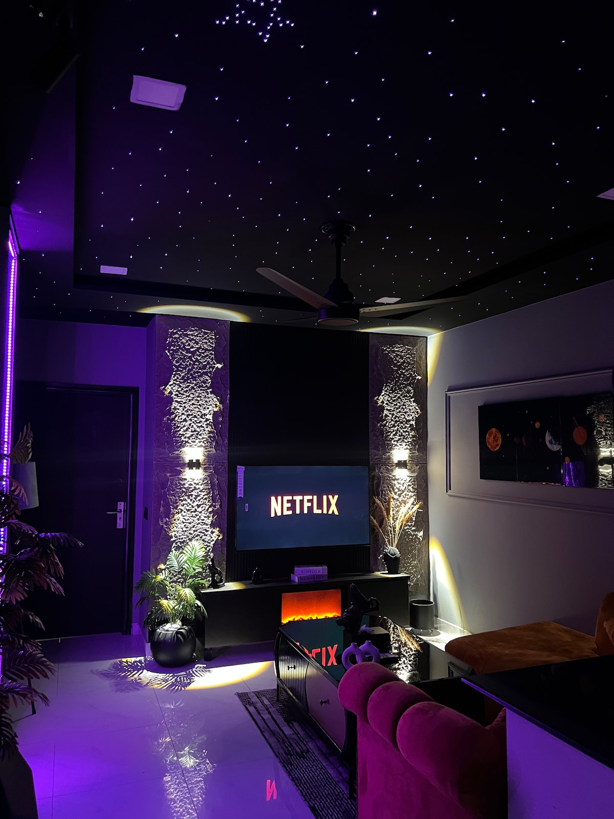 Step into a bold, neon-lit 1BR lounge designed for pure vibes. Enjoy the glowing starlight ceiling, moody lighting, PS4 gaming, and sleek modern décor that makes every moment feel premium. Perfect for couples, solo guests, and creators who want style and atmosphere. Pool, gym & cinema hall access included for your stay.