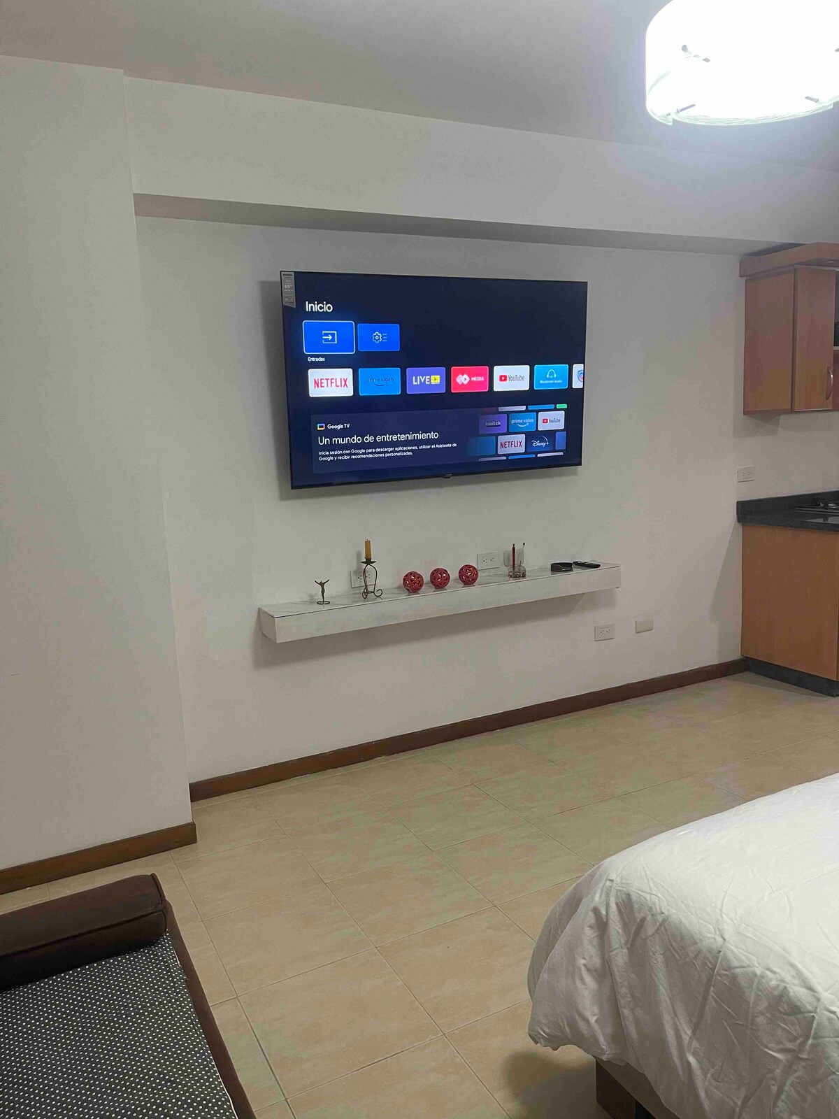 Disfruta de una experiencia con estilo en este alojamiento céntrico, con todas las virtudes de un hotel en la intimidad de un apartamento. Decoración única con todas las comodidades y servicios. Está diseñado para 1 hasta 3 personas, 1 habitación con una cama Queen y 1 sofacama matrimonial en la sala, con lencería de algodon Baño con diseño espectacular, toallas de alta gama. Cafetera, licuadora, horno microondas, cubiertos, vajilla, ollas, etc Tanque de agua planta eléctrica 50% Vigilancia 24h