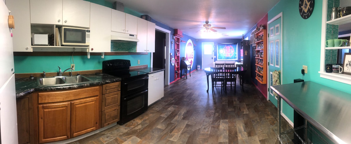 在這個獨特、舒適、適合家庭入住的地方留下一些回憶。1,350平方英尺的開放式概念在2間臥室可供4人舒適入住,但其中一個起居區域中的6英尺芝加哥小熊隊標誌旁邊還有一張隱藏牀,可容納2個小孩。 辣醬牆裝滿了。 一層,廚房、較小的起居區域和浴室以及兩間臥室都有地暖。 主客廳有瓦斯壁爐,還有窗戶空調。 房子後面有大型開放式院子。