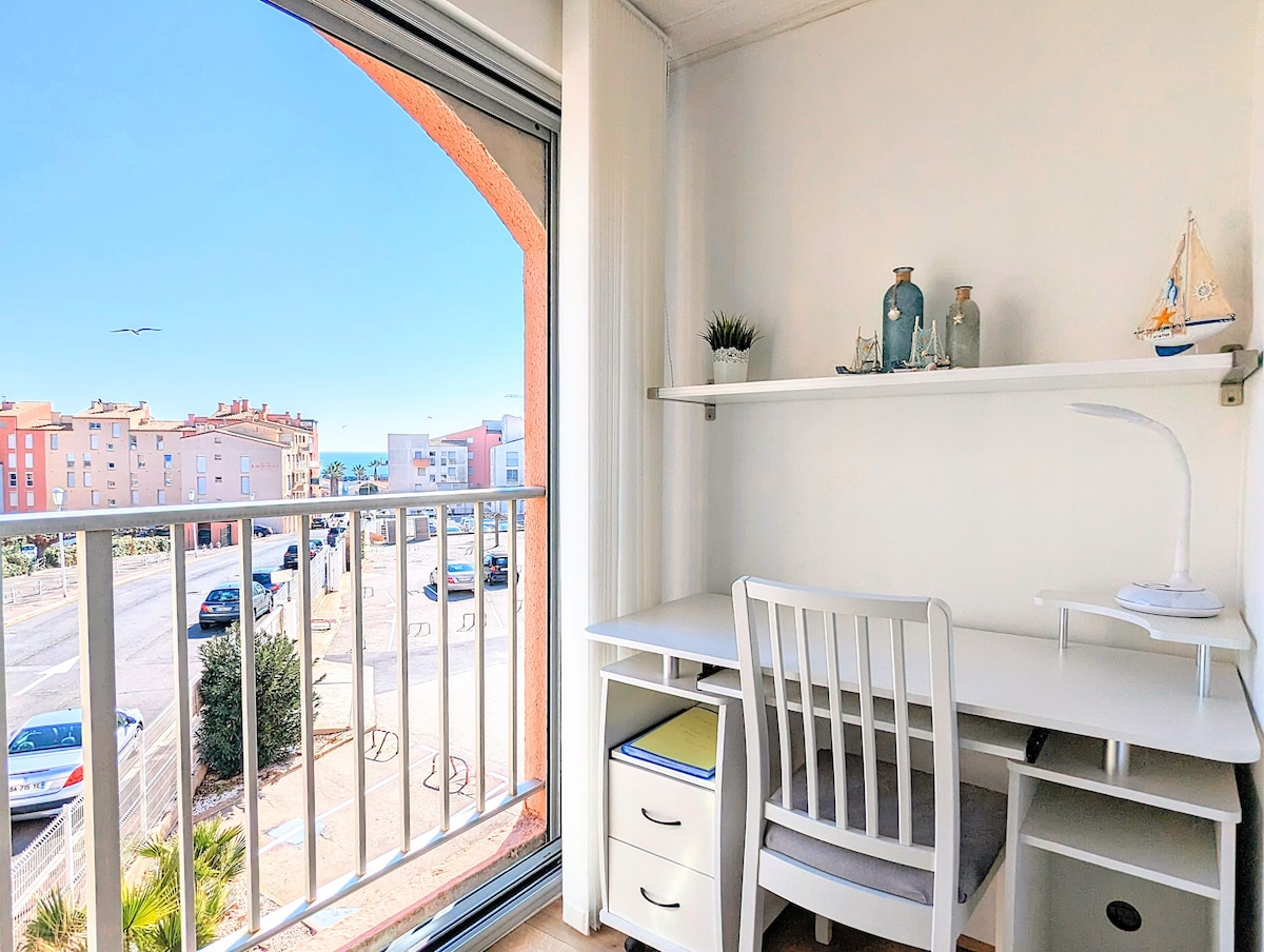 45 平方公尺的舒適公寓,2 間客房 + 閣樓。 寬敞明亮,面向大海,有空調,三樓有電梯。 可俯瞰海景、布雷斯庫堡 (Fort Brescou) 和外港的全景,無對面建築。 客廳配有大型落地窗,可俯瞰朝南的露臺,不受外界干擾,配有電動遮陽篷和花園家具。 廚房和浴室於 2023 年翻新。 臥室配有一張 160 公分的大床。 樓上夾層有 2 張 90 公分的床。 免費安全停車位。