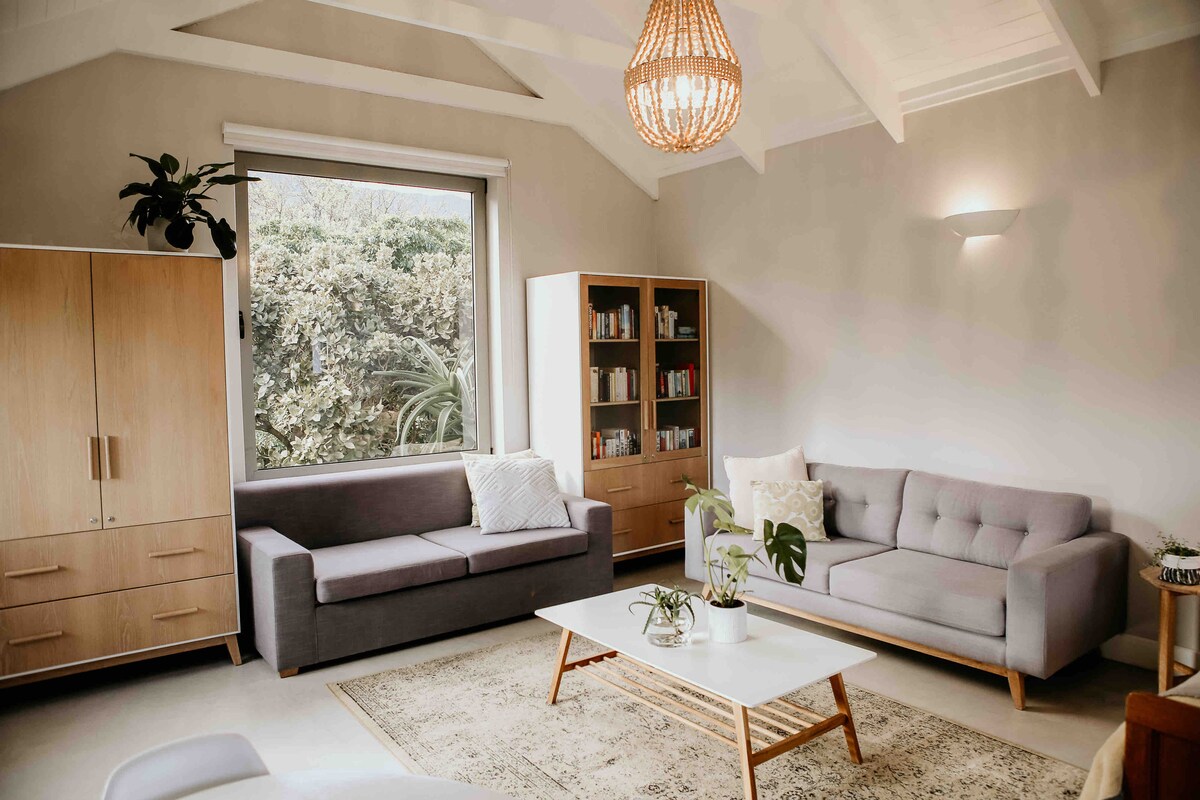 我們寬敞的閣樓公寓有備用電源,可讓我們通過第5階段的負載分流。 位於Onrus一個可愛、安靜的街區,步行即可抵達海灘、潮池和海岸小徑。閣樓擁有充足的自然光線和美麗的山景。有一張大床和一張小孩沙發床。寬敞的休息區,提供書籍和旅遊指南。小廚房是一個功能齊全、實用的空間,您可以在這裡泡茶或咖啡,或準備輕食。
