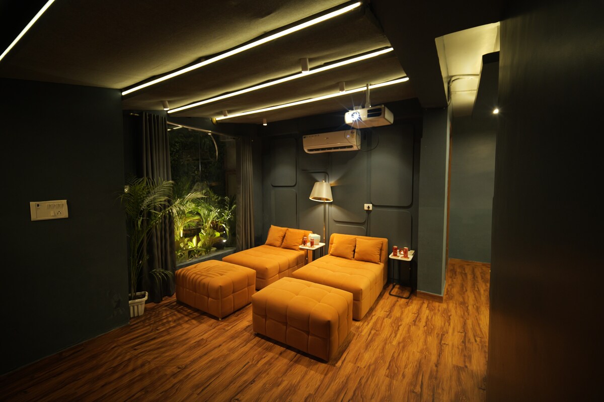 Cinéma by Vyagram是一間位於一樓的2BHK,專為沉浸式住宿而建。 客廳兼作家庭影院,配有100英寸投影螢幕,由Epson 8350和模塊化座位供放映、體育之夜和團體聚會。 開放式廚房設備齊全,適合烹飪和接待。 兩間套房臥室,一間配有特大床,另一間配有沙發床,為情侶或團體提供靈活性。 空氣淨化器、變頻電源、智能電視和精心策劃的DVD庫,讓體驗更完善
