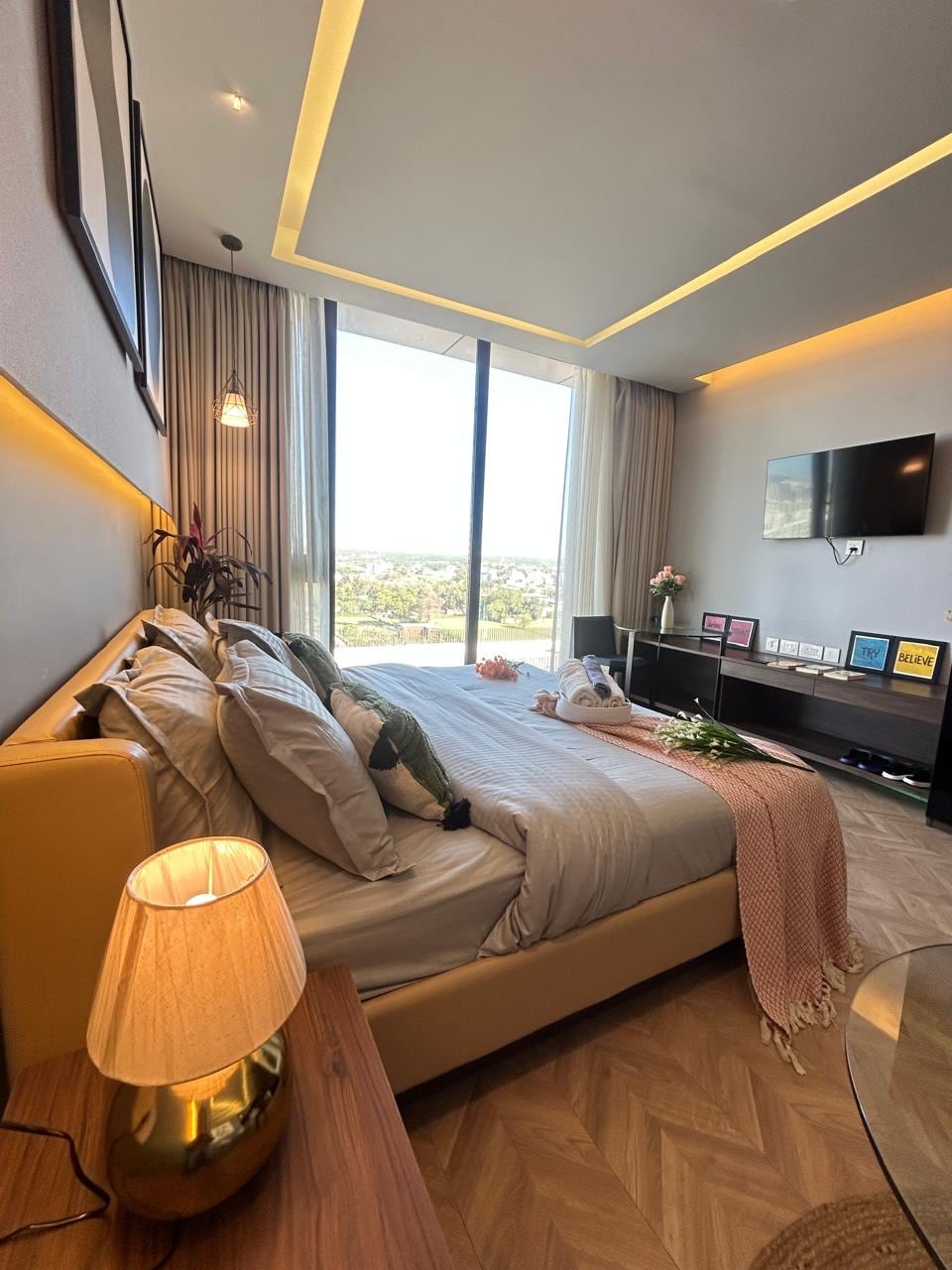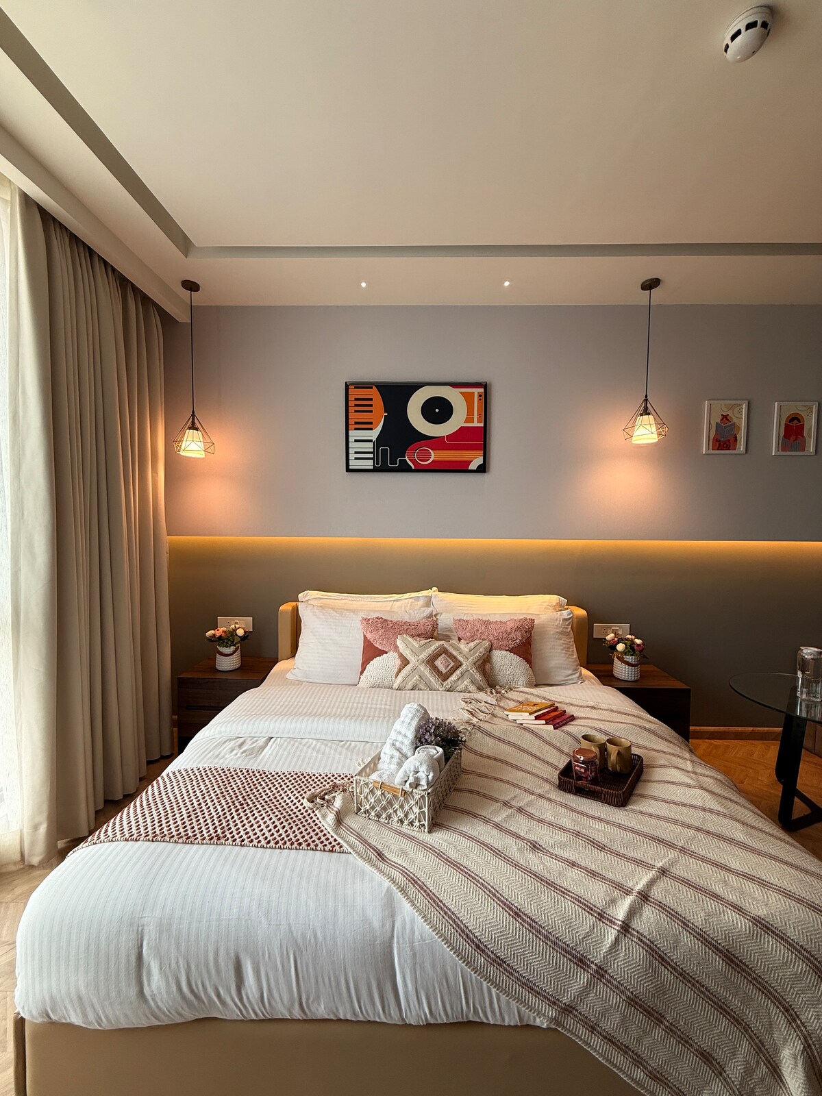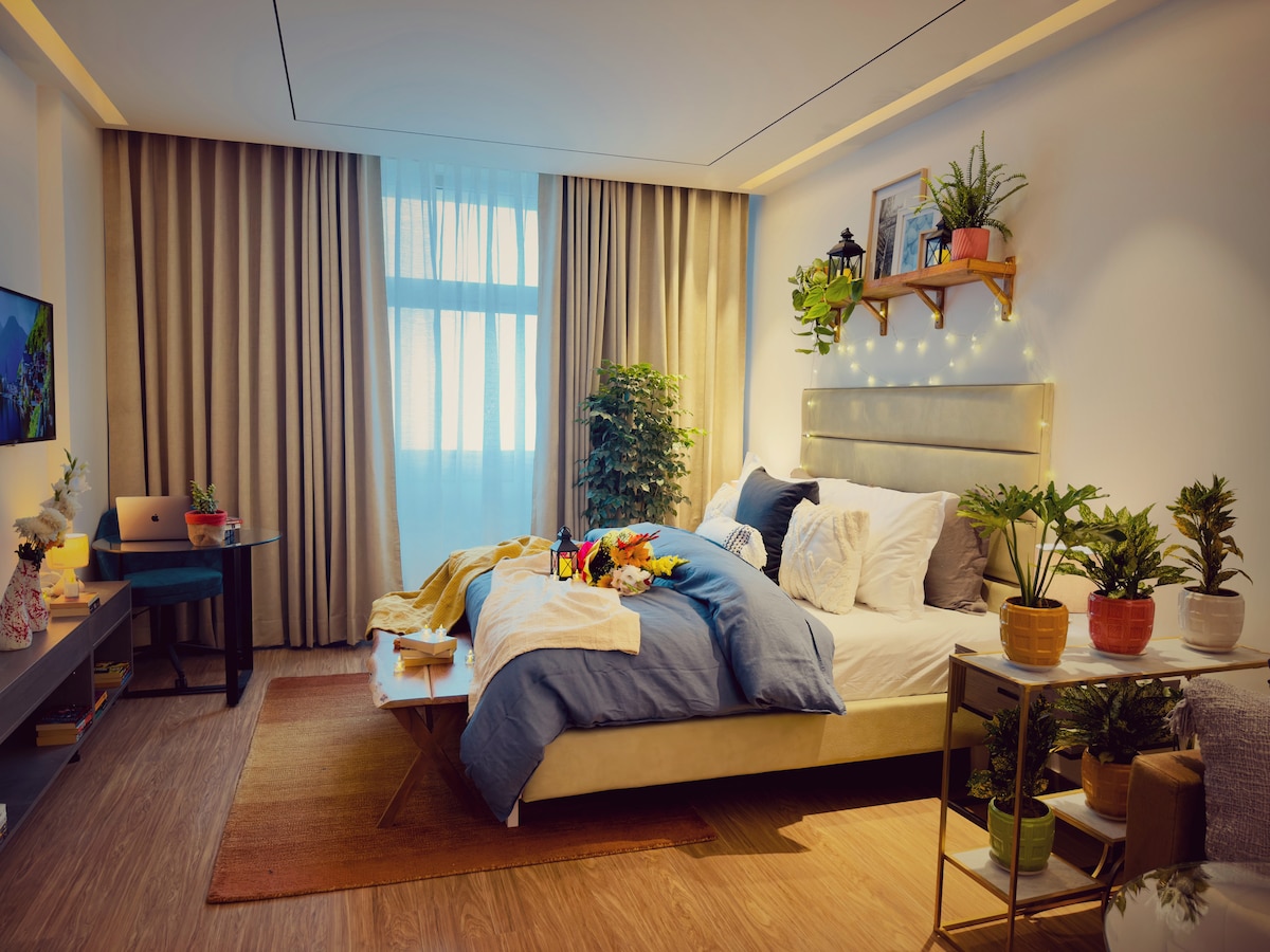 歡迎來到我們位於高樓大廈15樓的驚人套房。這間2bhk是全新的公寓。 寬敞的私人露臺,可欣賞城市天際線景觀,獨一無二。此房源非常適合放鬆身心,欣賞現代建築的美景。公寓配有3臺智慧電視(所有應用程式都可使用)、2張舒適的雙人床、2個帶儲物櫃的大衣櫃、6人沙發、時尚咖啡桌、熨衣板、冰箱、微波爐、電磁爐、電熱水壺、烤麵包機等