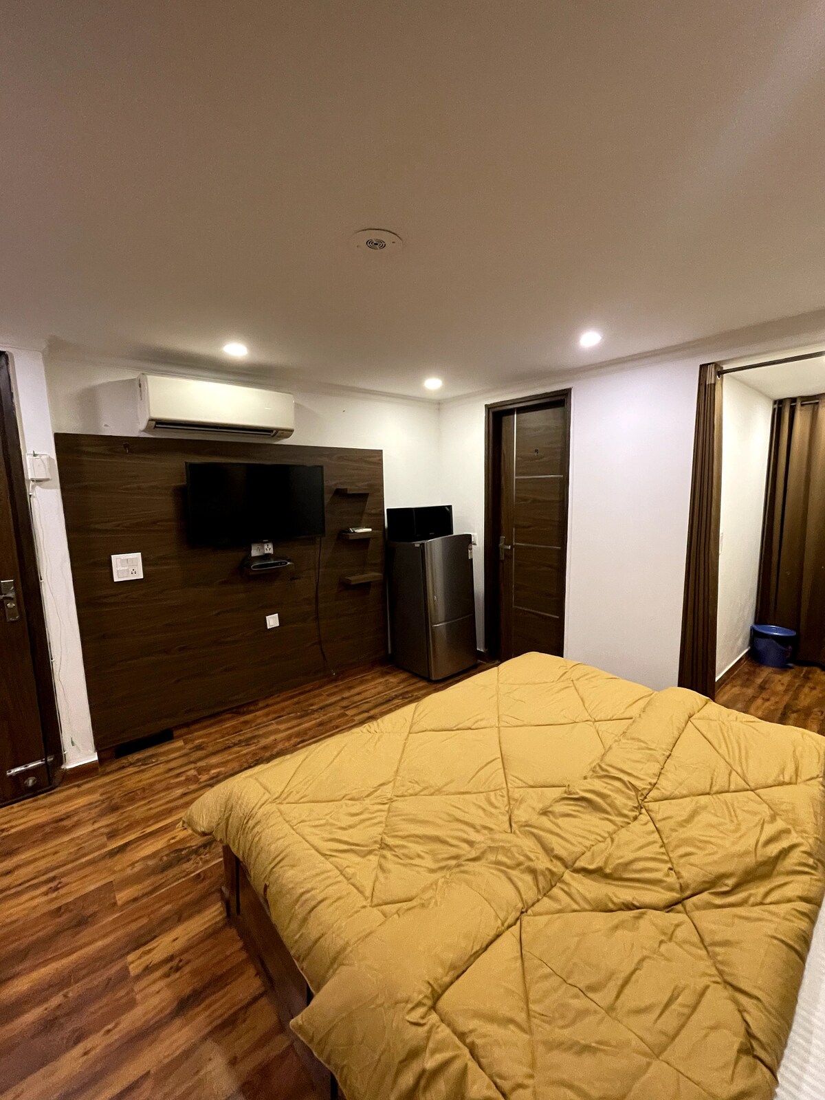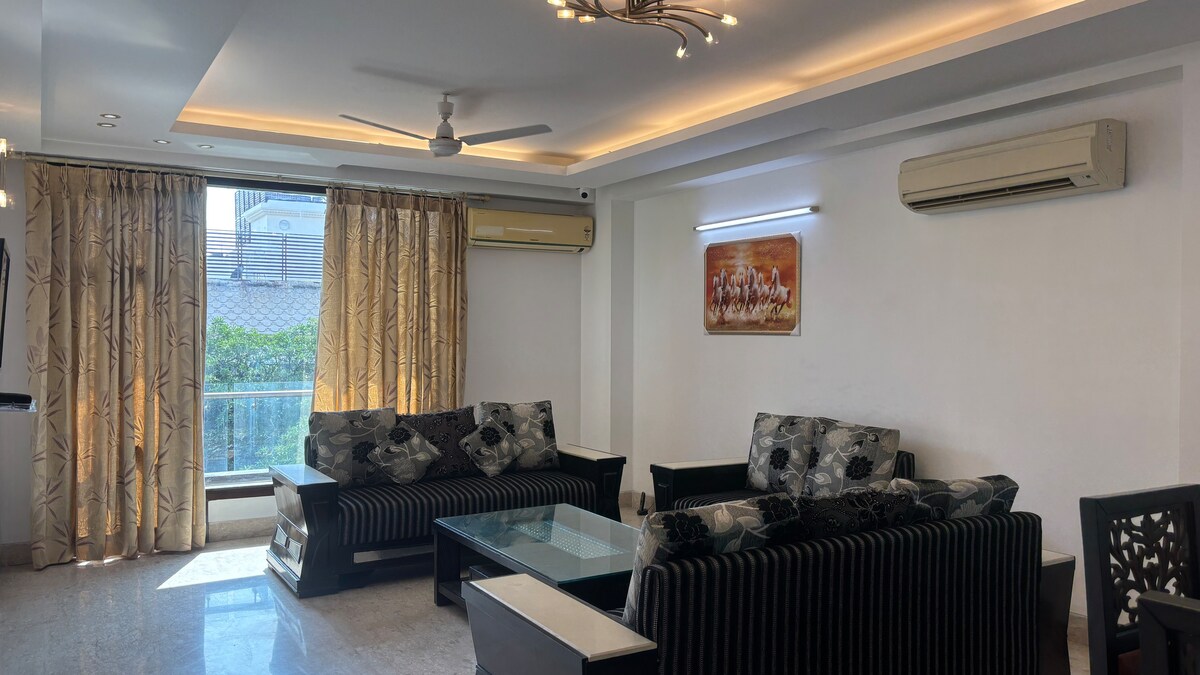 Independent, Secure & Super Clean! Private Studio apartment (Bedroom + Kitchen + Bathroom) operated by its own key card, with High Speed WiFi, 42" LED TV with Netflix, Clean White Bedsheets & Towels. Located in a quiet corner of a bustling South Delhi Area in a CCTV secured building with 24x7 availability of Uber & AutoRickshaw. We are only 10 Km away from the International Airport.