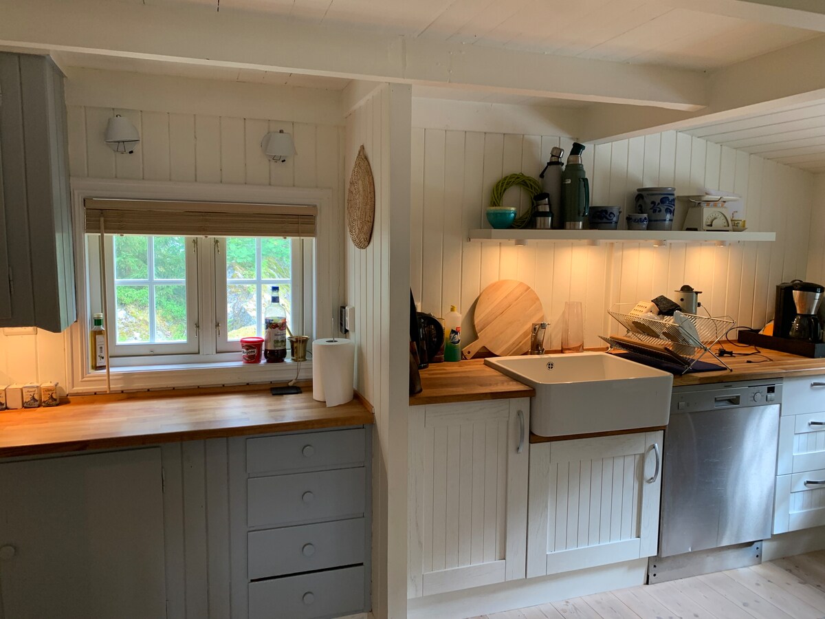 Hytte med fantastisk utsikt i rolige omgivelser. Kort vei til fjorden og en robåt er tilgjengelig i sommerhalvåret. Hytta har minikjøkken, kjøleskap, liten stekeovn og micro. Ikke oppvaskemaskin. Bad med dusj og toalett, varmekabler i gulvet. Stue med salonggruppe, spisebord og en koselig peis. Soverommene er svært små. Overbygd veranda med utemøbler. Sengetøy og handduker er ikke inkludert. Når snø, må man parkere ved veien og gå de siste 50 m opp til hytta. Parkering ved hytta om sommeren.