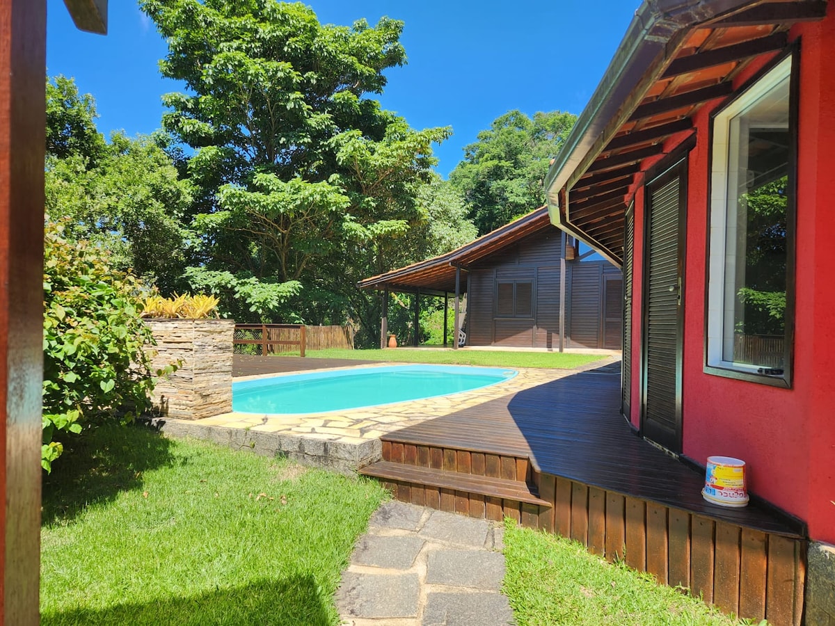 Miguel Pereira的美麗小屋,有4間套房和綜合空間,配有廚房、燒烤、電視、客廳和休閒空間。 超級舒適的氛圍,周圍是迷人的鄉村。 非常適合尋找放鬆環境的家人和朋友(最多18位成人)的會議,同時靠近市中心(開車3分鐘或步行10分鐘)。 泳池、燒烤、撞球和乒乓球桌、排球和足球。 Wi-Fi。可選廚師/管家。