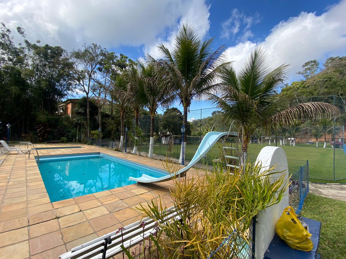 在大西洋森林環繞的寧靜之地,與全家人和朋友一起放鬆。 Ala Casa Sede 1間半浴室 7間套房 泳池翼 2間套房 1間廚房(大) 1燒烤 戶外區域 Mini Fazendinha 足球場 成人泳池 兒童泳池 適合釣魚的湖泊 注意:移動區域不太好,最好的運營商是OI。 - >提供Wi-Fi
