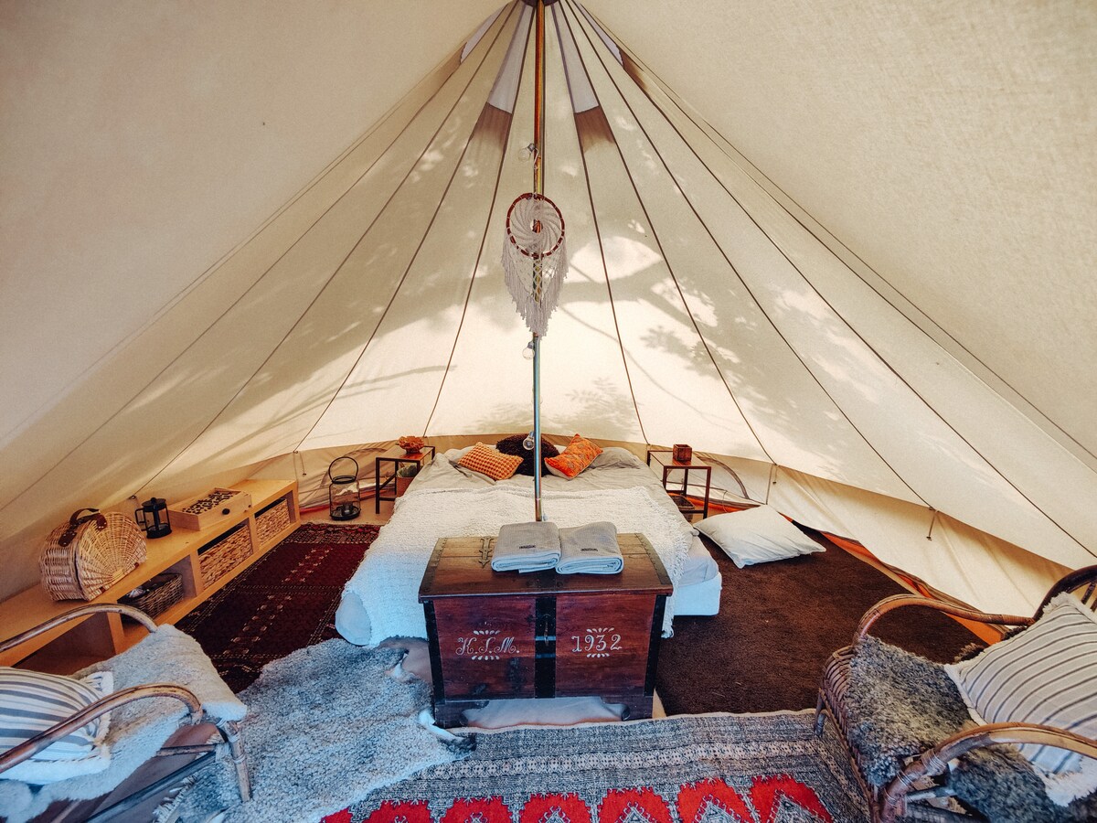 享受這個浪漫自然房源的可愛環境。 入住豪華帳篷,配有新鮮的牀鋪,醒來後,大自然的鳥鳴聲! 帳篷每晚出租,包括早餐。 您可以入住1-5人 帳篷可容納5人。 總是整理一張雙人牀。 您可以在這裡入住1-3人。 一張沙發牀可以拉出,只需一張單人扶到2張牀。 此外,如有需要,還有充氣牀墊可供充氣。 清掃和清洗幹淨。 包括牀單、毛巾和最終清潔服務。