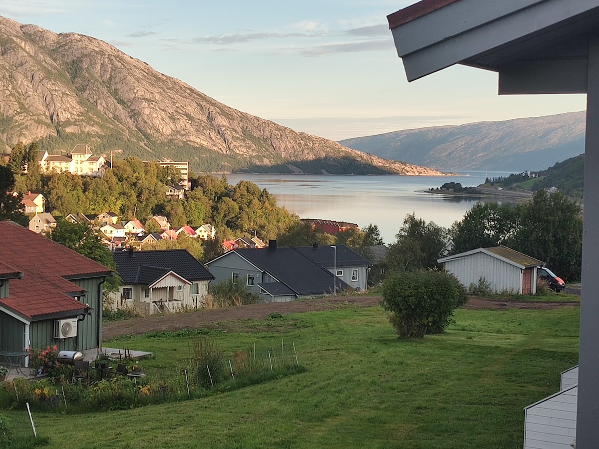 Velkommen til en koselig, solrik leilighet fem minutters kjøretur fra Mosjøen sentrum. Utsikten er nydelig over fjord og fjell. Leiligheten ligger i et fredelig område. Dette er et privat hjem hvor det til daglig bor både hund og katt. Boligen vaskes grundig mellom hvert besøk, men passer derfor ikke for personer med kraftig allergi.