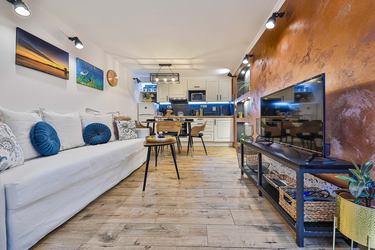 我們美麗、充滿光線的藝術公寓邀請您入住這個高級住宿。頂級的地方和優質的務! 一切都是全新的,獨特的室內裝潢和超過70平方公尺的空間。非常適合家庭或一群朋友入住。在陽光明媚的露臺上,您可以欣賞島嶼的最佳海濱海景,並欣賞日落。