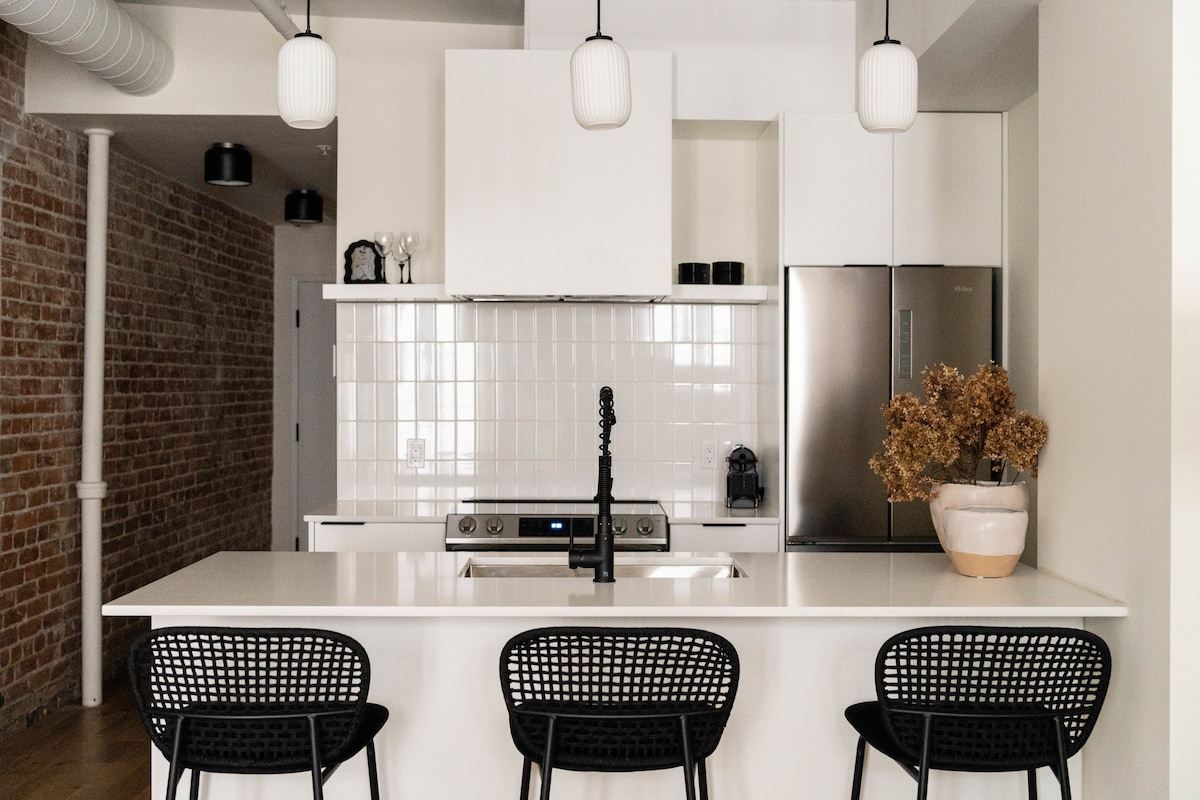 令人驚嘆的老港口頂層公寓,將歷史魅力和時尚的現代設計結合在一起。 一間獨立臥室和兩間時尚的閣樓房間可供8人入住,每間客房均配有高大的隔板和門鎖。 高聳的天花板、裸露的磚塊和溫暖優雅的飾面。 享受主廚的廚房、65英寸高清電視和電影之夜投影機、遊戲角落和緊湊的辦公空間。 距離蒙特婁最好的餐廳、商店和文化僅幾步之遙。