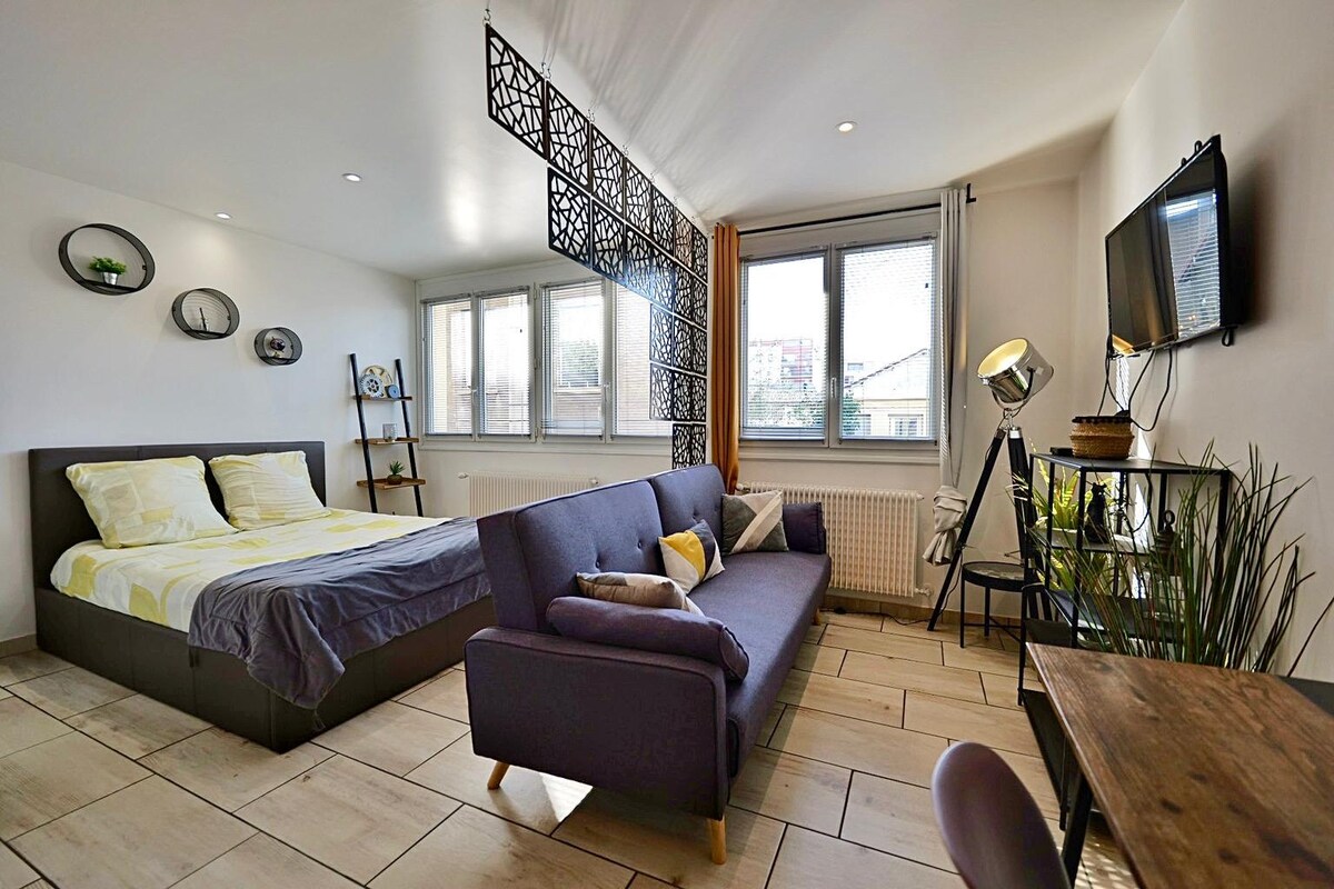 在這間獨立單間公寓中放鬆身心,位於我們房子的花園層。 可直接前往私人露臺,有停車位。 房源距離電車站 0.45 英里,距離 Geoffroy Guichard 體育場 22 分鐘步行路程(1 英里),距離 TGV 鐵路車站 30 分鐘電車路程。