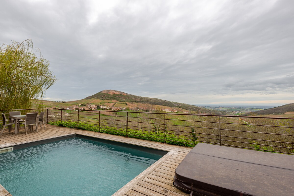 Maison avec vue panoramique sur les vignobles et sur les 2 Roches, sans vis à vis, site classé, piscine ext (de mai à sept) , jaccuzzi sur la terrasse (sauf en cas d’interdiction préfectorale si canicule - 200€/semaine de remb si pas de spa ), cinéma 8 pl. , sauna infrarouge , à côté des caves. Lorsque nous partons, nous louons notre maison principale sauf notre chambre. Nous demandons par conséquent attention et respect.