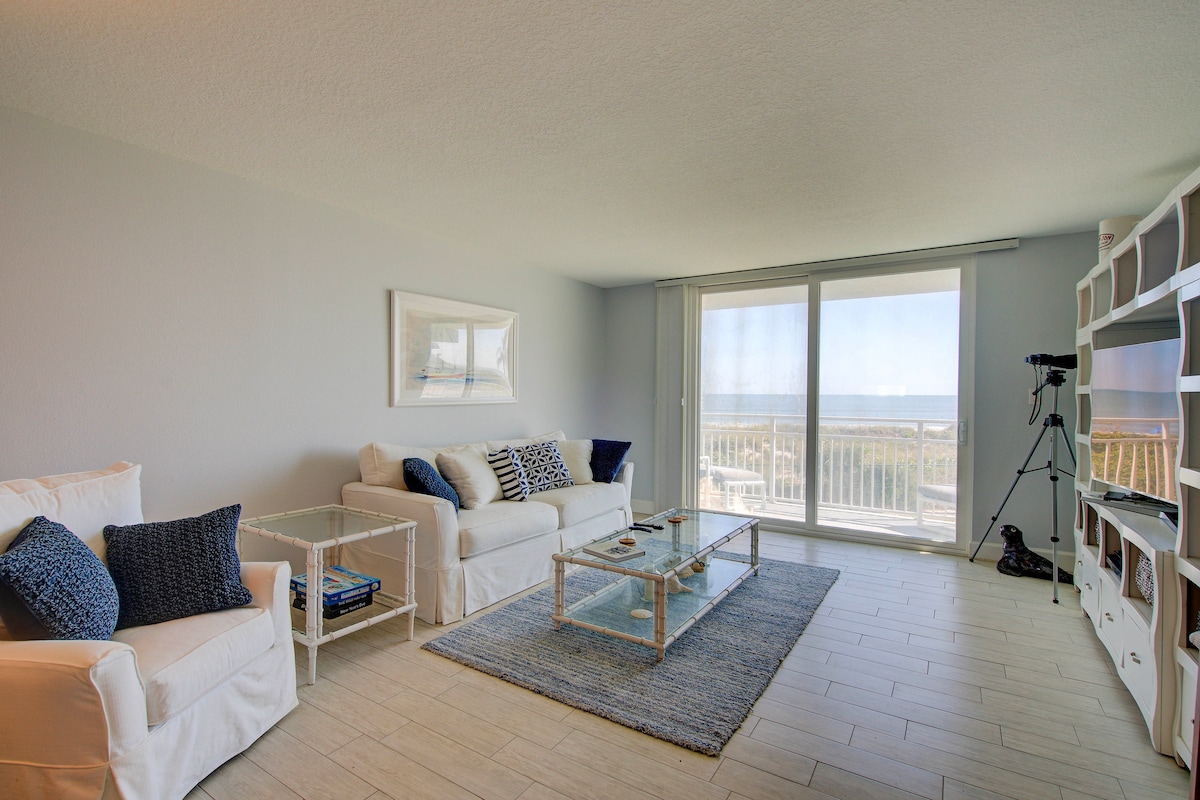 放鬆享受大自然! 2/1最多可容納6位房客。 安靜的20單位大樓。1樓單位,前面就有部分海景。 步行50步即可抵達海。 提供帳篷、沙灘椅、冷卻器和毛巾。 從後院享受難忘的日落或火箭發射。 去海龜散步。 設備精良的廚房,備有線電視和Wi-Fi。 大樓內有洗衣機/烘乾機。 步行距離內的餐廳。 距離Publix 3分鐘路程。禁止攜帶寵物。
