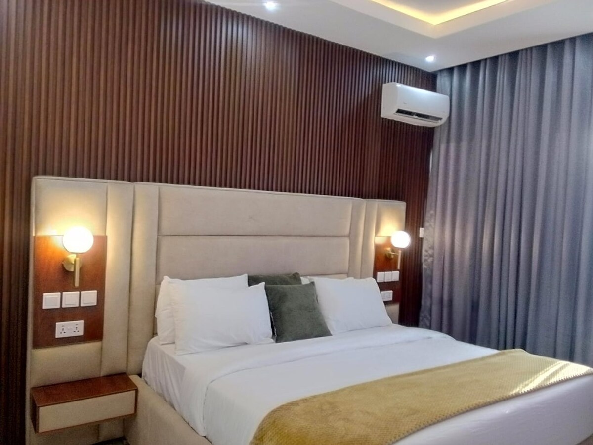 歡迎來到Elmstead Luxury Aprt ,你在Lekki Ikota的時尚度假勝地。 這個2BR/2BA天堂提供冷氣舒適、客廳配有65吋電視、臥室配有43吋電視、免費穩定不限量Wi-Fi和24/7電源,配有逆變器和太陽能。 享受智能門鎖自行辦理入住手續、免費泊車、旅居內的洗衣機,以及兒童彈彈城。 1次免費清潔服務(適用於5至6晚以上的住宿)。 靠近Lekki保護中心、Mega Chicken、Blackbell和Blemco。非常適合獨遊旅人、商務旅人、家庭或長期住宿