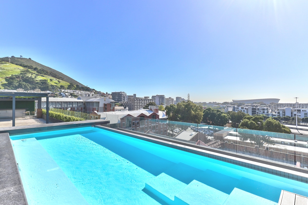 Airbnb費用(含) 超棒的桌山景觀I極佳的位置I 24小時保安I屋頂泳池I燒烤架I安全泊車 位於Docklands ,距離V & A Waterfront僅幾分鐘路程。 擁有16平方米的陽台,可欣賞桌山、惡魔峰和獅子頭的超美景觀。24小時出入控制、閉路電視、公共屋頂設有溫水泳池、燒烤架和安全車庫的專用停車位。 桌山、開普敦體育場、海濱、克利夫頓和坎普斯灣都在10分鐘路程內。