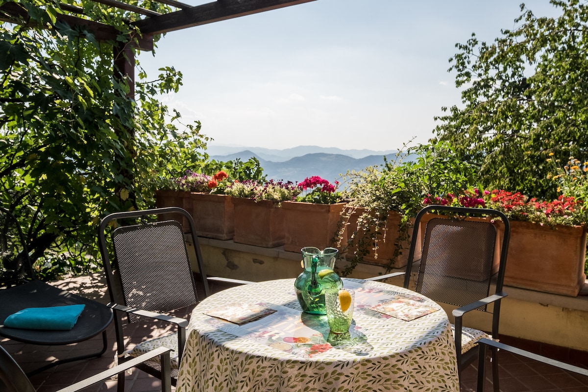 Charming one-bedroom in Italian villa with a private terrace and brand-new air conditioning! Just a short walk from the famous Via degli Dei trail, this cozy retreat features a fully equipped kitchen, private bathroom, queen bed and breathtaking mountain views from your bedroom window. The friendly family below grows fruit and nuts and makes cakes, sauces and fresh pasta from scratch. Enjoy authentic countryside living with modern comfort and a warm, welcoming atmosphere!