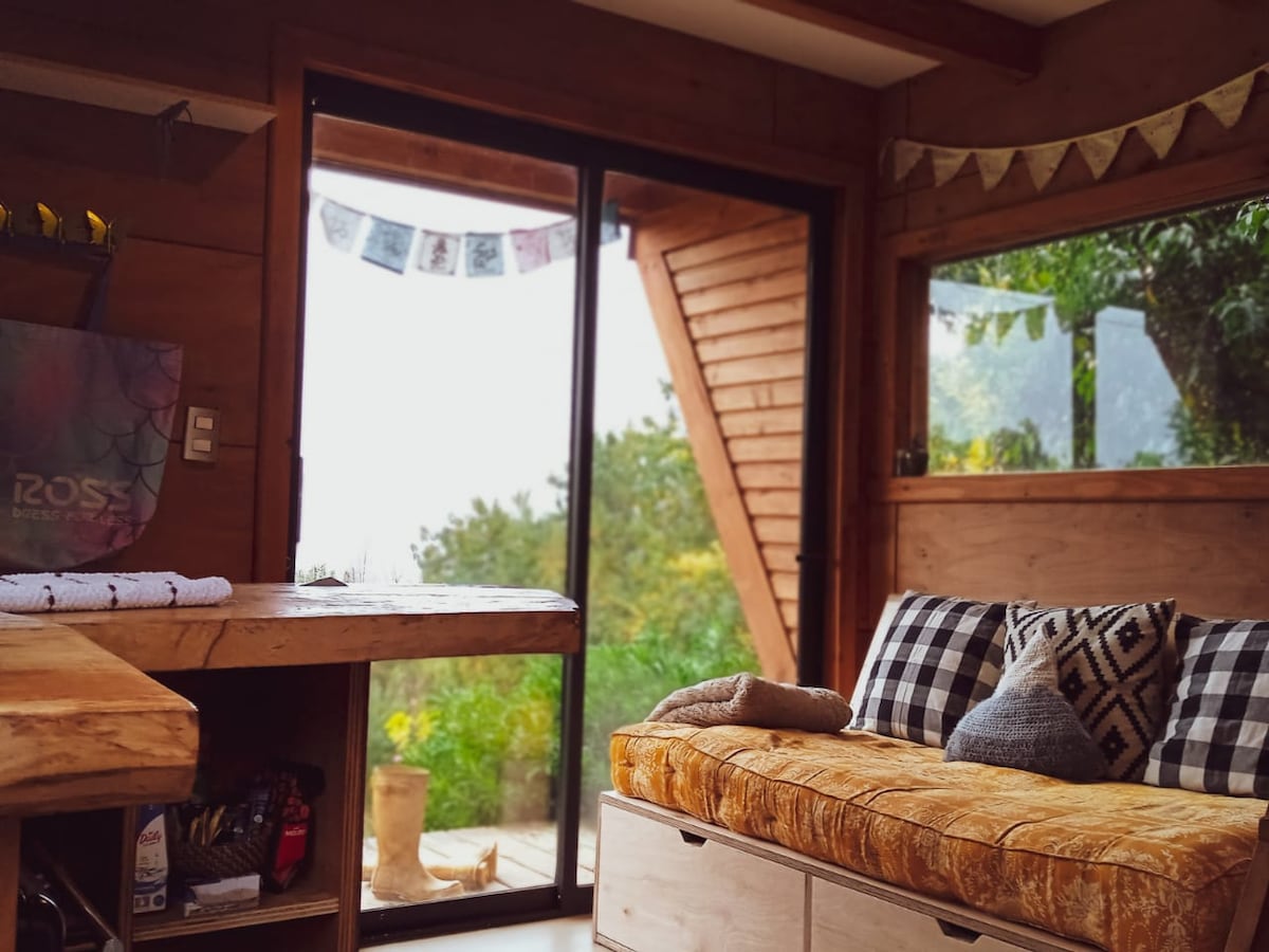 Our cozy recently built tiny home has amazing views of the pucon valley and is located only 7 mins by car or four miles from the city center. The last quater mile to the house is a gravel road with two steep hills and is only for 4x4 or awd cars. The tiny home is located near the famous waterfall "Salto del Claro" and is not more than a few minutes from the "Rio Turbio" which is great for hiking or in summertime taking a deep in the volcanic spring waters.
