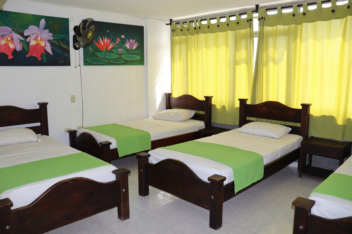 房間有6張單人床、儲物櫃、兩個淋浴間、一個馬桶和一個洗手盆,每張床都有風扇和手機連線。 步行5分鐘即可抵達Unicentro、超市、銀行、餐廳、藥店,輕鬆前往市內任何地點。 一樓有我們的貴族咖啡,週末可以享受我們的酒吧及其活動。