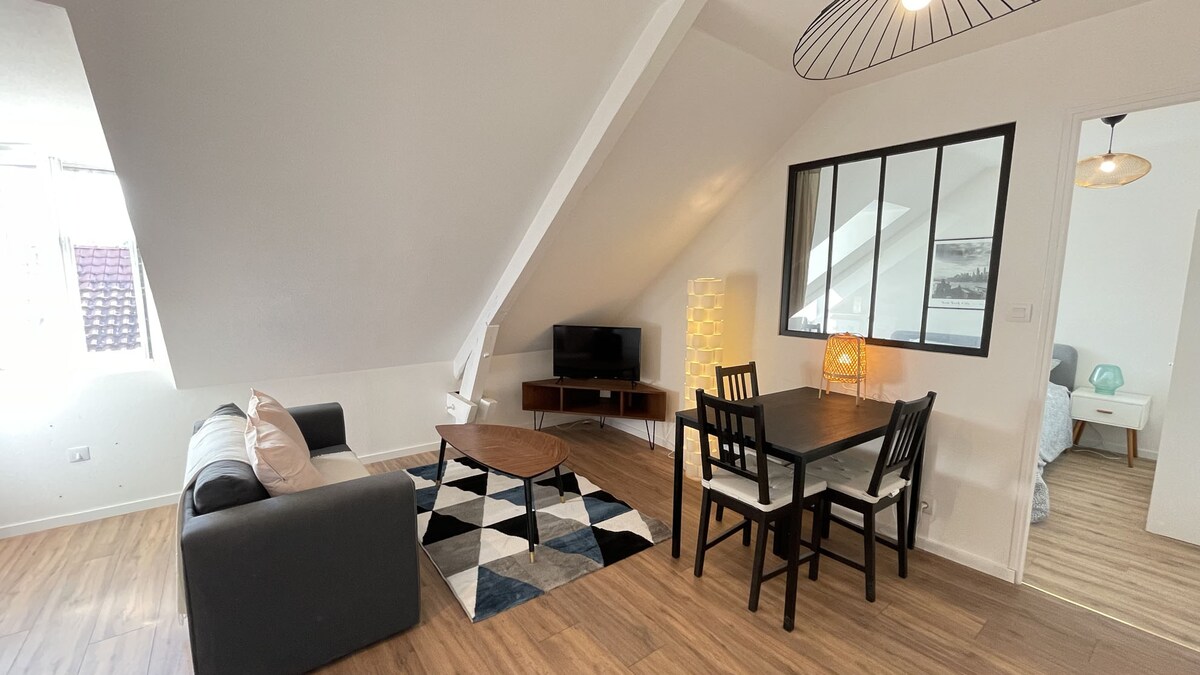 享受優雅的 2 間房間住宿,位於市中心,重新翻新,有隔熱,步行 2 分鐘即可抵達火車站,8 分鐘即可抵達歷史中心,免費停車。光纖 WiFi、辦公空間、電視。廚房配備齊全,洗衣機、洗碗機。禁止吸煙。位於二樓,安靜的美麗建築,配有數位密碼鎖。自助入住。如果提前抵達,行李可以存放在地窖。