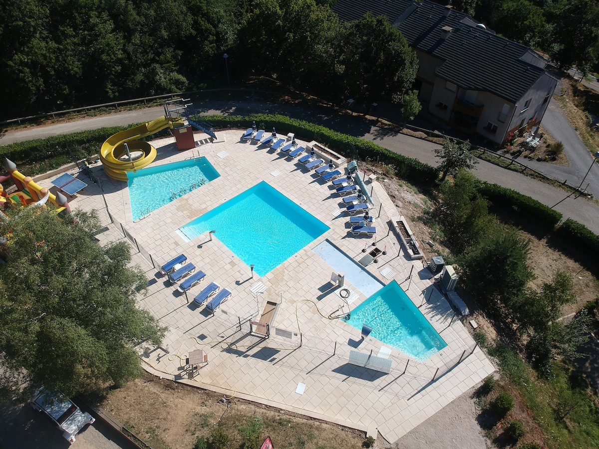 Joli chalet au pied des GR tout confort ( four, plaque électrique, grille pain, micro-ondes, machine à laver, lave vaisselle.) Grand jardin sous les châtaigniers. Table extérieure et transats mis à disposition. Chalet composé d'une chambre avec un lit 140 et une autre chambre avec lits superposés. Le clic clac peut être utilisé pour un couchage pour deux. Parking privé. 3 minutes en voiture du lac, à 500 m des commerces du centre. Activités proches ( Accro branche, base nautique.)