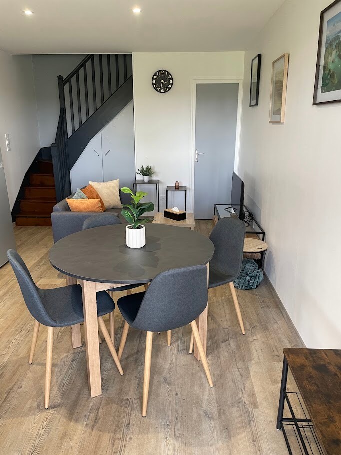 私人公寓,可容納一對夫婦或一個人。 可提供嬰兒設備(折疊床、高腳椅)。 DOLCE GUSTO 咖啡機(含咖啡和茶)、水壺。 配有電動門的停車場、花園家具和烤肉設備。 位於郊區邊緣,距離克魯瓦-蒙查南 (CREUSOT-MONTCHANIN) 的高速鐵路車站 5 公里(距離巴黎 1 小時 20 分鐘,距離里昂 40 分鐘)。 距離購物中心 5 分鐘,靠近孔布遊樂園 (Parc d'attraction des Combes)。