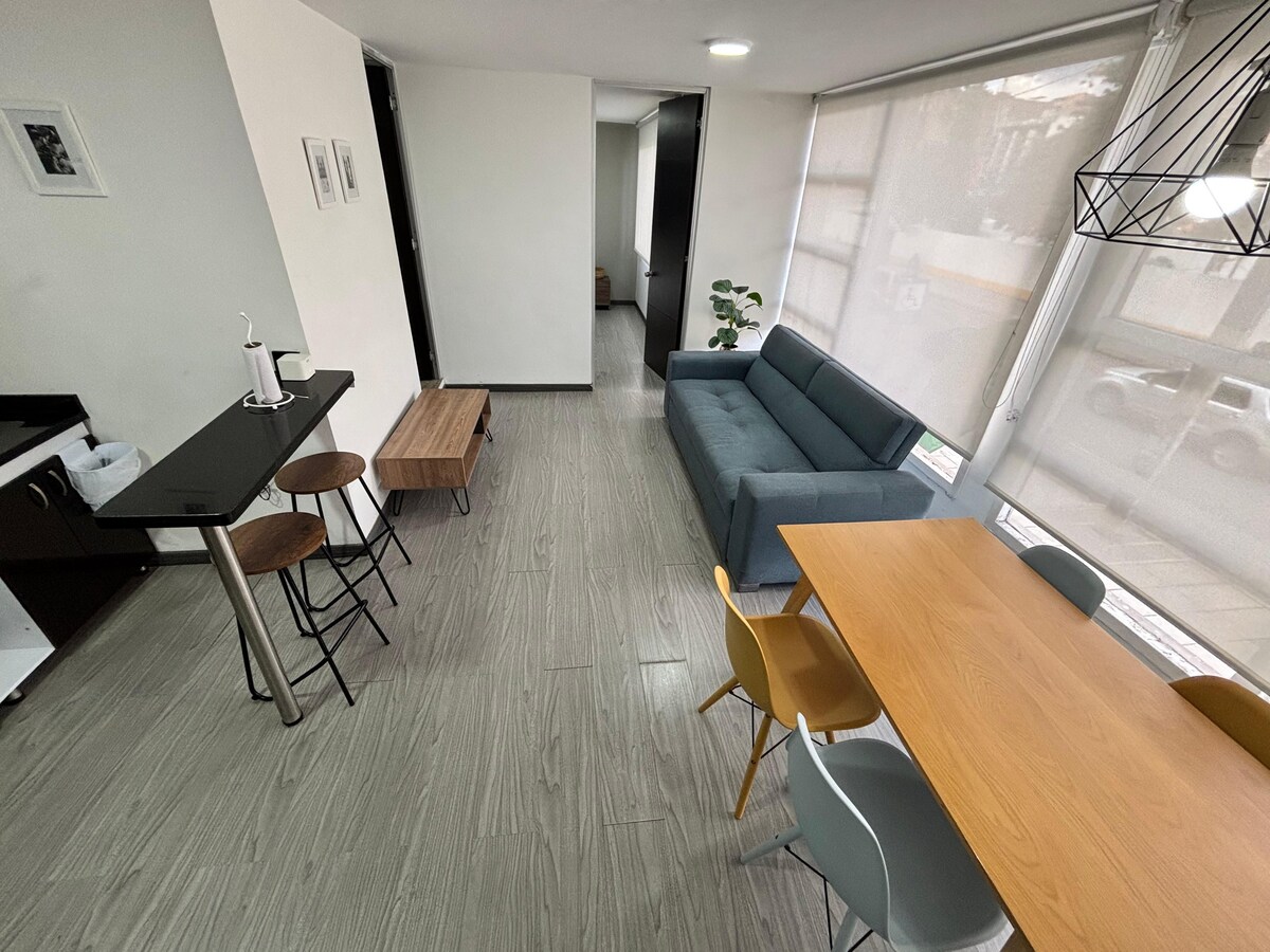 這個地方有一整套公寓,地理位置非常好,靠近一切,高速光纖網絡,包含服務。 1雙人牀、1臺智慧電視、設備齊全的廚房、1間帶Hidroducha的浴室。 接待處全天候提供服務,工作人員會說英語和西班牙語。 靠近Andino Mall、Park 93、Virrey Park、Embassies Spain、UN、El Chico Museum ,機場距離13公裏 位置策略