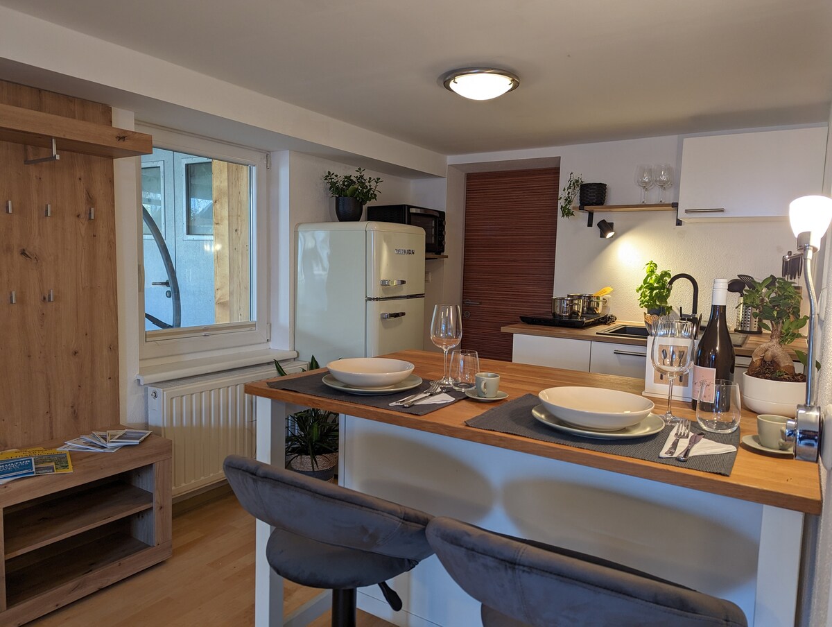 Schön eingerichtetes kleines Apartment im 3. Stock gelegen (ohne Lift) mit Blick über den malerischen Mondsee. Ein Schlafzimmer mit Doppelbett, Dusche und Waschbecken (im Schlafzimmer, kein separates Bad). Wohnküche mit Herd und Backrohr, kleiner Kühlschrank (kein Gefrierfach), Nespresso Kaffeemaschine, Wasserkocher mit Essecke. Kleines Wohnzimmer mit ausziehbarer Couch. WC extra. Bitte beachten: Nichtraucher-Unterkunft.