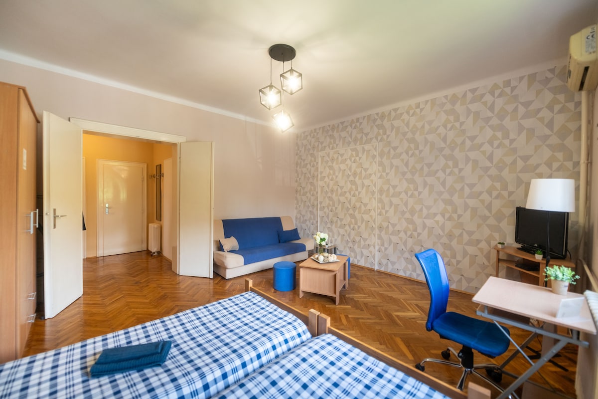 安靜的43平方米單間公寓,位於Vracar街區,靠近聖薩瓦寺。 一張雙人牀和一張雙人沙發牀,提供額外的枕頭和毛毯。 角落廚房和獨立翻新淋浴間。 WiFi、有線電視和廚房桌子可供工作。 街上提供免費停車位。