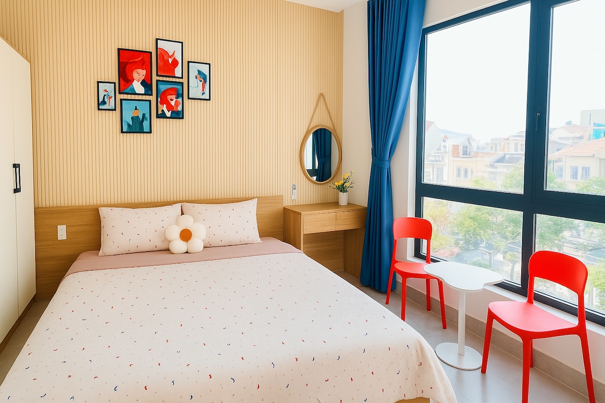 ✔️ Phòng Apartment(40m2) - 1 Giường 1.6m x 2m - Cửa Sổ Kính Cong cực rộng - Ban Công + Bàn ghế cafe - View Nội Khu Yên Tĩnh Thoáng Mát - Lưới chống muỗi, côn trùng - Thiết kế CNC sang trọng ấm áp - Ghế Sofa êm ái + Bàn trà - Bếp Điện & Full Dụng Cụ Bếp Nấu - Bồn Rửa Chén Bát - Lò Vi Sóng + Máy Giặt Gia Đình - Máy sấy, Ấm siêu tốc + Tủ Lạnh Mini - 2 Ly Thuỷ Tinh , Muỗng - 1 Bình Trà Thuỷ Tinh + 2 Gói Trà + 1 Gói Coffee Hoà Tan - Wifi, Smart TV 43 Inch Youtube - Vòi Sen Tắm Đứng Nóng / Lạnh