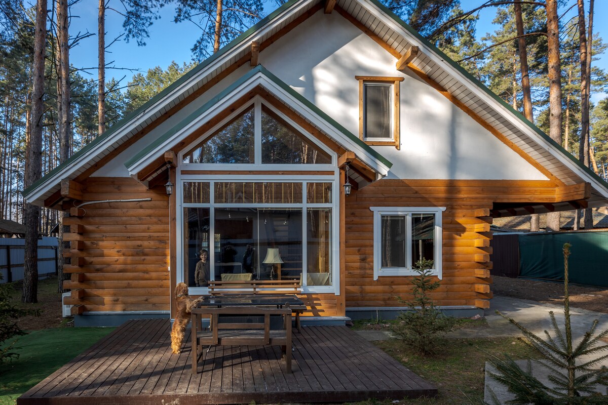 在森林裡租一間房子,距離湖泊200公尺。 溫馨美麗,四周環繞著森林。 基輔市中心25公裏。 房子是用天然材料建造的