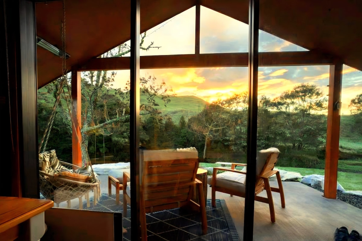 River Song Cabin at Ripples Retreat is all people imagine about NZ — rolling hills, rainforest, a calm river & birdsong. Hand-built on our family farm & surrounded by Hobbit landscapes, this romantic king studio cabin sleeps 5 with a cosy bunk nook. Couples love the outdoor bath & stargazing; families enjoy kayaking, fishing & meeting the sheep. Many stay 3–5 nights for waterfalls, glowworms, Hobbiton & beaches — or as a soft landing or gentle goodbye to NZ. Stay 4+ nights for a free farm tour.