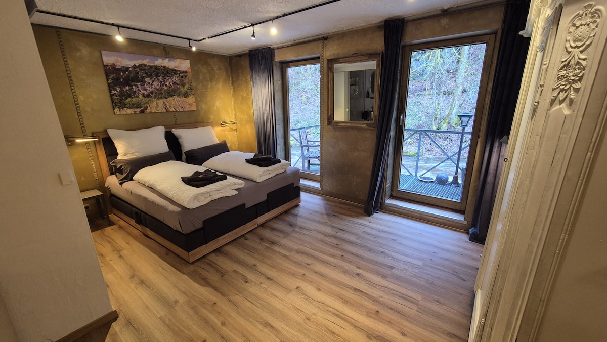 Situé en bord de rivière, superbe logement de 175 m2 implanté dans une propriété de caractère avec parc ! Espace extérieur privatif ( accès directement depuis l’appartement) magnifique avec Jacuzzi prof, bbq, salon et table d'extérieur. Sauna intérieur Idéal pour un couple en recherche d'intimité pour se ressourcer et découvrir les richesses de la région. Pour une réservation de 2 pers, seule une chambre sera accessible (sauf supplément 30€/nuit). Situé a 2 min d'une gare SNCB.
