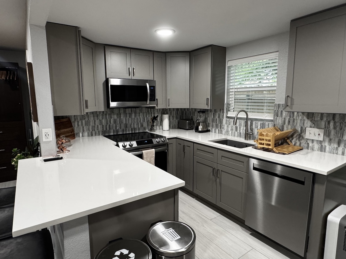 全面翻新,位於市中心的1BR,有私人巷道入口和停車位。閣樓臥室通過梯子式樓梯進入,讓空間感覺開放。舒適的組合式沙發提供了豪華的地方,可在觀看電視時放鬆身心,或供第三位房客睡覺。遠程工作設定包括高端監視器和可透過USB-C集線器存取的無線周邊設備。歡迎寵物。新洗衣機和烘乾機。步行即可抵達街區,距離UT僅10分鐘或15分鐘即可抵達市中心。