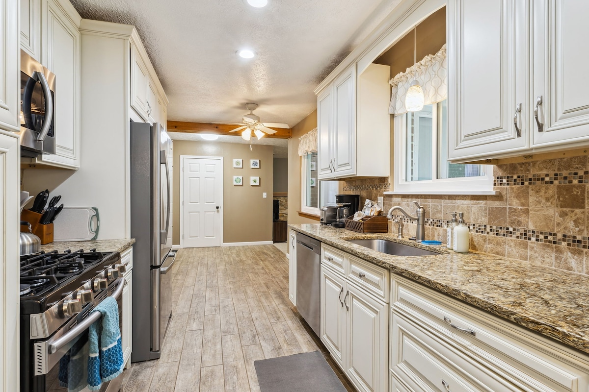 我們的復古風格度假木屋提供僻靜的森林環境,方便前往方便的便利設施! 我們適合家庭入住的空間可供6位房客舒適入住。 每個房間都經過精心設計,方便您進行正宗的美學。 整個房源都是屬於屬的。 設備齊全的廚房和洗衣房是一個很好的獎勵。 在陽光明媚的雨天,在寬敞的前廊上品嚐一杯新鮮的咖啡。 附設的3個車庫和車道可供充足的停車位。