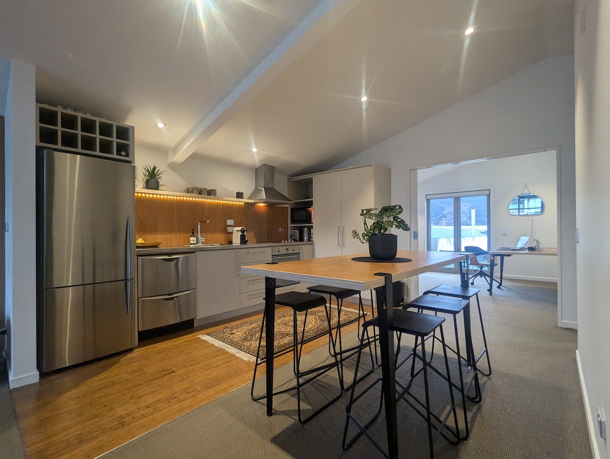 寬敞、時尚的現代兩臥室公寓。 距離湖泊、餐廳、咖啡廳和村莊商店不到700公尺(步行7分鐘即可抵達)。 非常適合2對夫婦或家庭入住,配有2張超級加大雙人牀或1張超級加大雙人牀+1張超級加大雙人牀,配置為2x 1x。 溫暖、陽光明媚、私密、安靜和1x樓層,前門旁邊有停車位。 全新的廚房和地板。 精心設計,提升您在瓦納卡的住宿體驗。 完美的滑雪和度假基地。