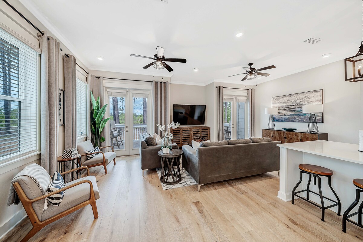 入住這棟位於Prominence的新建、專業設計的連棟房屋,體驗30A的奢華。 騎單車或滑板車前往Gulf Lakes或Deer Lake海灘(公共)只需5分鐘。 位於Alys、Rosemary、原始海灘和頂級當地餐廳附近。 設備齊全的廚房 - 4輛賽格威電動滑板車 - 4 輛 Beach Cruiser 單車和幼童單車拖車(可容納 2 名兒童) -沙灘毛巾、雨傘、椅子、沙灘玩具 -溫水泳池 -對面是大型休閒區
