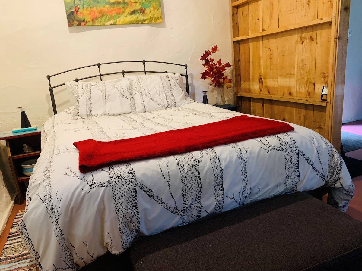 森林小徑、營火、雞和羊、郊狼在夜空下嚎叫! 開車直達我們50英畝農場後面森林中的私人小木屋。 大床、客廳、露天小廚房就在門外的有蓋門廊上。 冬日溫馨舒適。 夏天涼爽陰涼。 太陽能板為燈光和手機充電提供電力。 小屋外有私人火坑和野餐桌。步行20秒即可抵達乾淨的私人戶外廁所。
