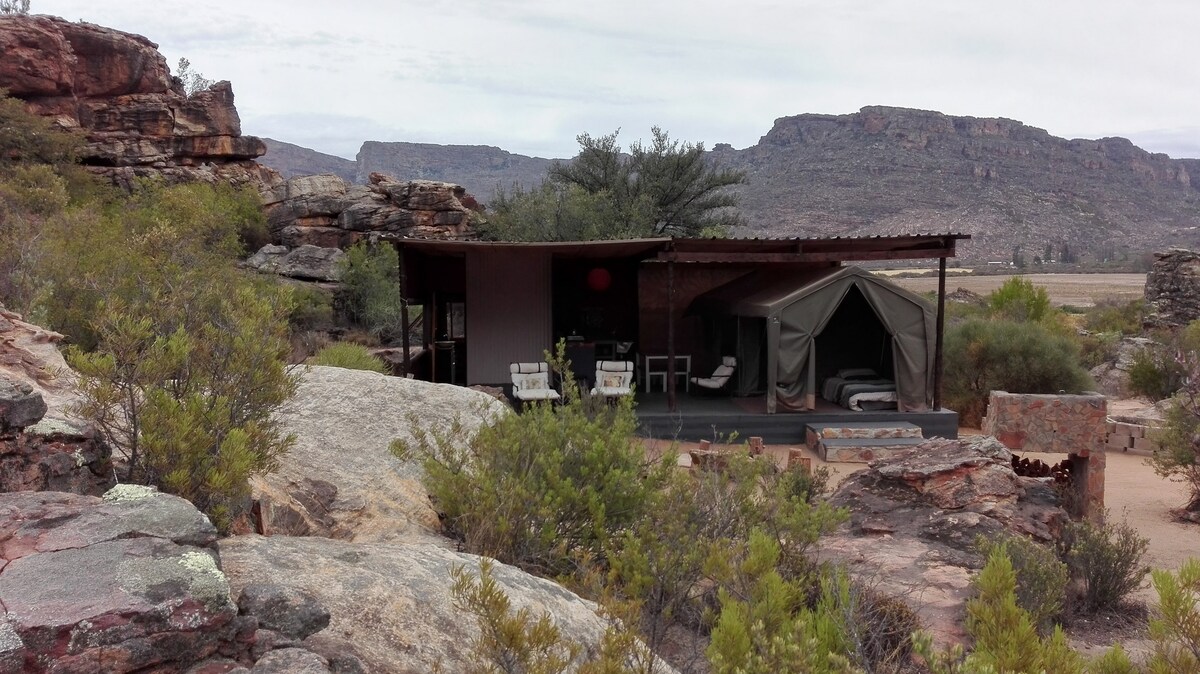 這個僻靜的帳篷位於一個偏遠的山谷中,周圍有戲劇性的岩石形成。可欣賞原始的fynbos和古老的waboom樹旁邊流淌的小溪的壯麗景色。 坐落在沒有手機訊號的山脈之間,我們為您提供獨特的體驗,讓您放鬆身心,為身體和靈魂充電。 您需要有一輛底盤高的車才能到達我們的地方。 如果您沒有高離地面車輛,我們可以安排交通工具,但需額外收費。