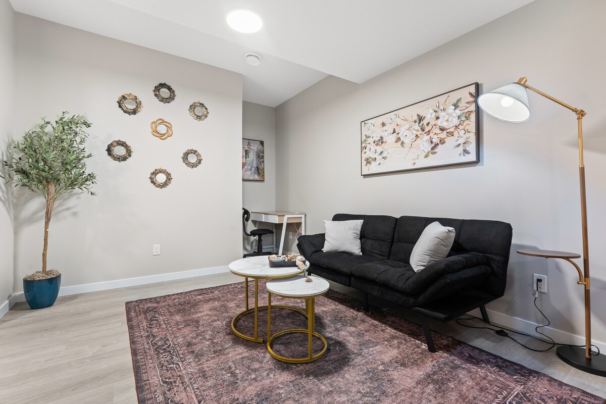 🏡 主要特色 ✔️ 明亮、一塵不染的合法地下室套房 ✔️ 2間睡房,配有大床和酒店級床單 ✔️僅限第5位旅人使用日式床墊–可應要求額外使用 ✔️廚房配有Keurig咖啡機 ✔️ 舒適的客廳,配有58吋智能電視✔️時尚室內懸掛椅 ✔️ 獨立入口及簡單的自行辦理入住手續 路邊或車道可✔️免費泊車 📍 附近 開車✔️2分鐘即可抵達購物中心 ✔️開車15分鐘即可抵達Rabbit Hill滑雪度假村 駕車✔️20分鐘即可抵達埃德蒙頓國際機場(YEG) 駕車✔️20分鐘即可抵達WEM