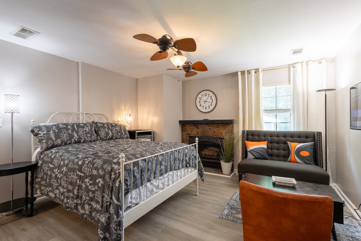 1張加州特大床和1張長沙發,適合睡覺。 浴室設備齊全,可滿足您的所有需求。 為每位旅人提供WiFi、床單、枕頭、毛毯、毛巾、洗漱用品、過濾水和咖啡機(配有咖啡粉)。 樓上有微波爐和迷你雪櫃。 旅人也可以在我們美麗的後院放鬆身心,配有一套阿迪朗達克椅。 旅人會從後院進入,爬上一小段室外樓梯。 我們會提供密碼讓你進入。