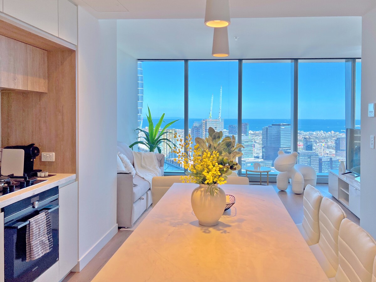 在墨爾本期間,您可以享受寧靜的空間,您自己的2間臥室2間浴室公寓(64平方公尺內部屋+ 6平方公尺陽臺)。以簡單現代和極簡的聖地為設計理念。欣賞這座城市的天際線。這是一個適合家庭入住的空間。 位於南十字星站和天空巴士站旁邊。位於免費電車區-墨爾本提供的一切都在您的指尖-靠近便宜的餐廳、高級餐廳和時尚咖啡廳。