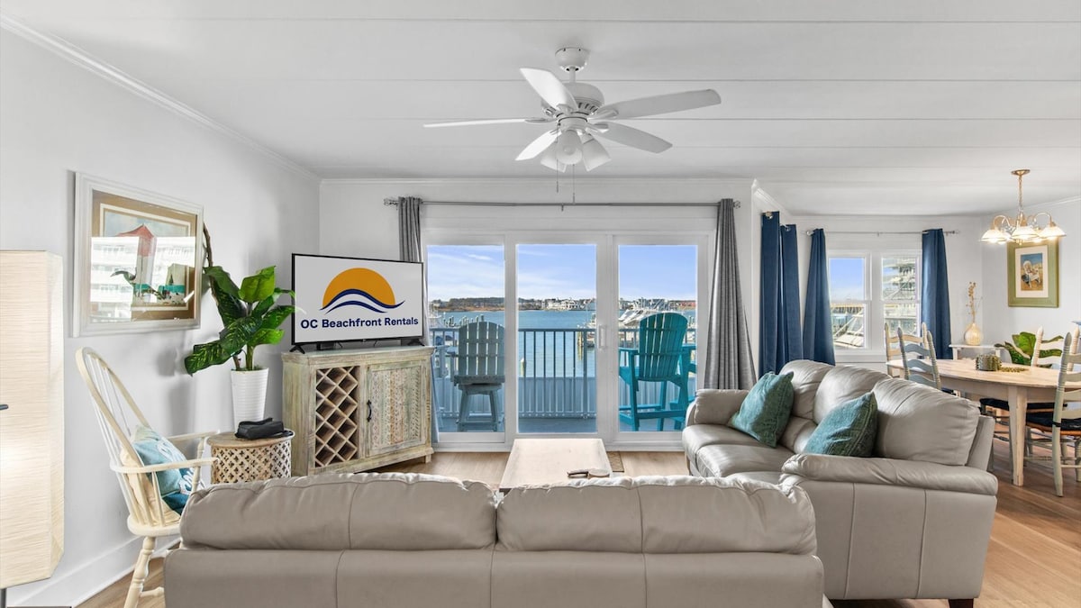 新翻修的公寓! ! -水景。 留意船隻交通。 -超大陽臺,有舒適的座位。 -舒適的LoveSac沙發。 -步行前往木板路或海灘- 15分鐘。 -步行前往Jolly Roger遊樂園。 -在單元下方的社區碼頭下方。 -靠近餐飲和購物。 -用於烹飪用餐的小廚房。 -高速WiFi和串流電視。 -充足的房源。乾淨的牀單、毛巾、衛生紙、紙巾、紙巾等!