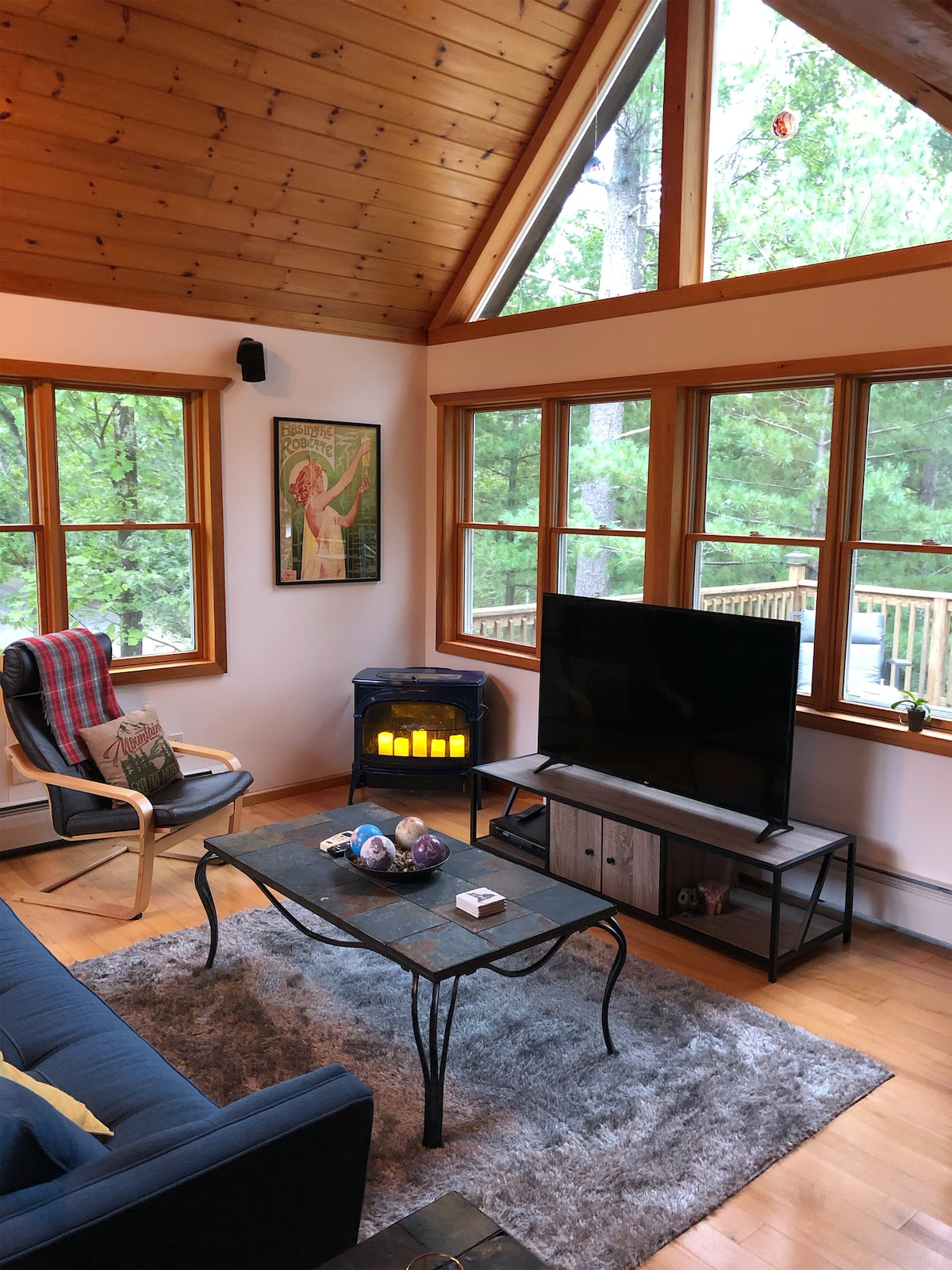 The Chalet坐落在一條私人道路上,四周環繞著高大的樹木,是一間三間臥室、三間浴室的三角屋,靠近卡茨基爾山和哈德遜河谷的所有主要景點。非常適合週末度假或長期住宿,非常適合情侶和家庭。房子有三層,每層都有自己的臥室、浴室和公共區域。在火坑旁放鬆身心,在露臺上喝早餐咖啡,在閣樓上閱讀一本書,或在樹林中散步。