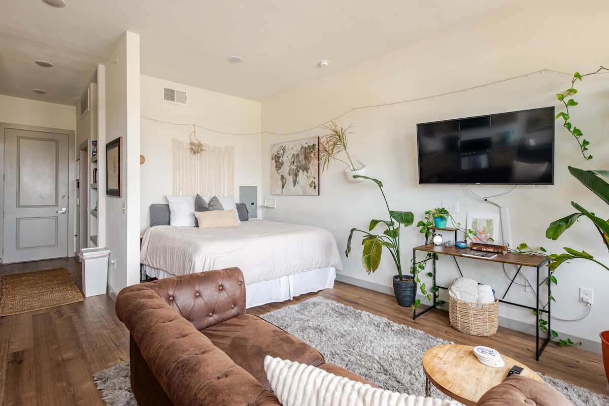 在這間充滿活力、擺滿植物的單間公寓中放鬆身心,享受市中心景觀的私人陽台,並可使用 24 小時全天候的屋頂泳池。房客對這裡的舒緩能量、綠意盎然的環境、裝潢和寧靜的氛圍讚不絕口,非常適合放鬆或工作。這間安靜的度假屋位於市中心,環境安全,也歡迎狗狗入住。房源內提供高速 Wi-Fi,非常適合獨遊旅客、情侶或商務旅客入住。房東會竭盡所能為你提供優質的服務,讓你體驗這個空間令人難忘的寧靜氛圍。立即預訂!