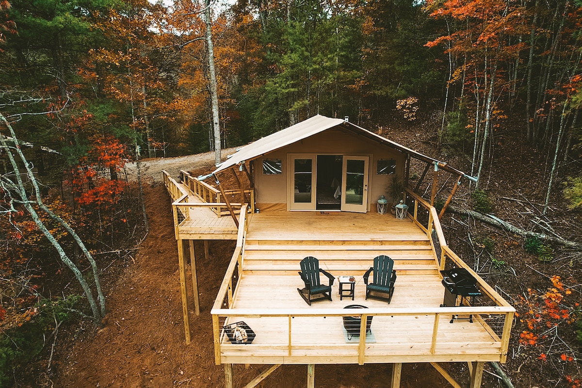 這個豪華露營帳篷一應俱全。 暖氣和空調、電視、景觀、烤架和新增的熱水浴缸! Thunderhead Ridge Getaways提供探索煙霧山的新方式。我們很高興能夠享受豪華的豪華露營住宿,欣賞田納西州Thunderhead山和大煙山的壯麗景色。享受大型豪華的部分遮蔽的露台,配有烤架。 查看我們的2BR「飛天松鼠」。 不可攜帶寵物 250美元押金。 在社交媒體上關注我們@thunderheadridgegetaways #Glampingwitha view