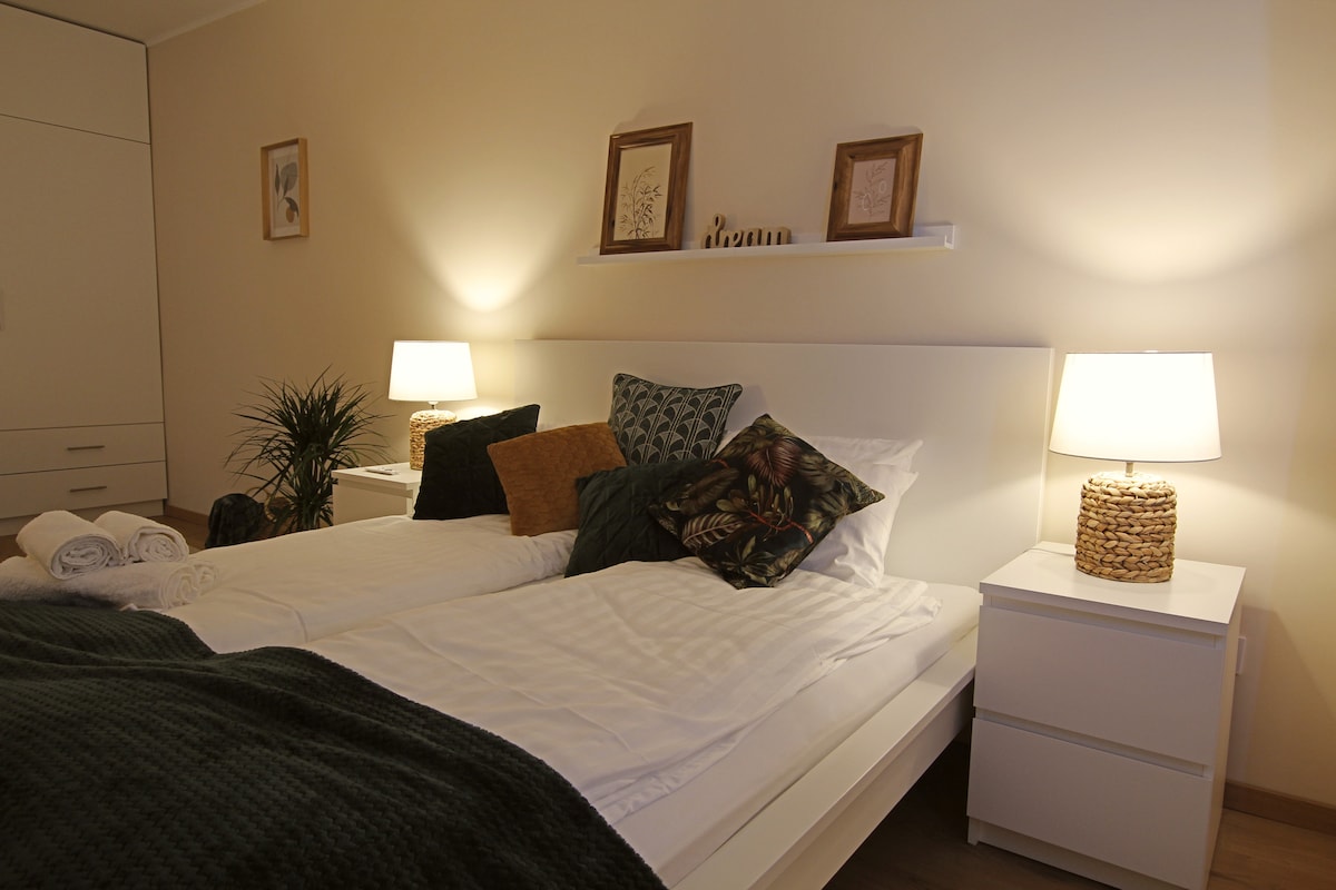 Cozy 1.5-bedroom bohemian apartment inspired by hosts life in Africa & Cuba. 2nd floor in 2-story villa houses, with balcony & patio. Beautiful view. Free secure parking in a gated community. Famous Thermal baths + swimming pools in Mosonmagyaróvár - only 15 min drive. Great for outdoor & sports lovers - Near bike paths +Wild water river rafting Čunovo, Divoká voda, is just 5km away. Perfect for day trips to Bratislava (20 min to centre by car), Vienna (1 hour), Budapest (2.5 hours), Rusovce