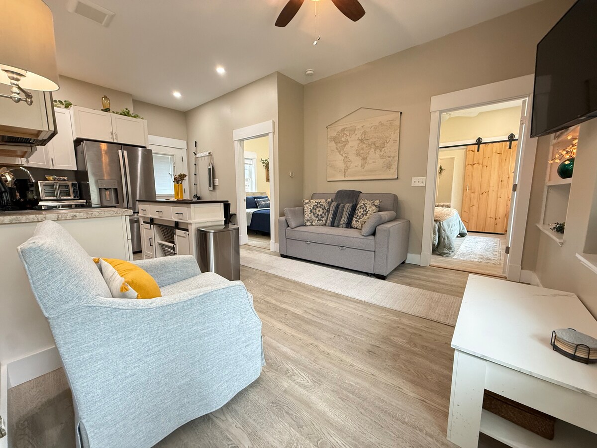 Located in a quiet neighborhood close to downtown. Private entrance. Spacious bedroom (14 X 11) with large closet and dresser. Open concept living room (14X11) with queen size sofa bed and dining table with 4 chairs. Small kitchen includes small electric stove, refrigerator, microwave, toaster oven, dishes and some cookware and Crockpot. Smart TV and WiFi. Bedding and towels provided. Full bath NO PETS. No smoking or vaping on premise or property.