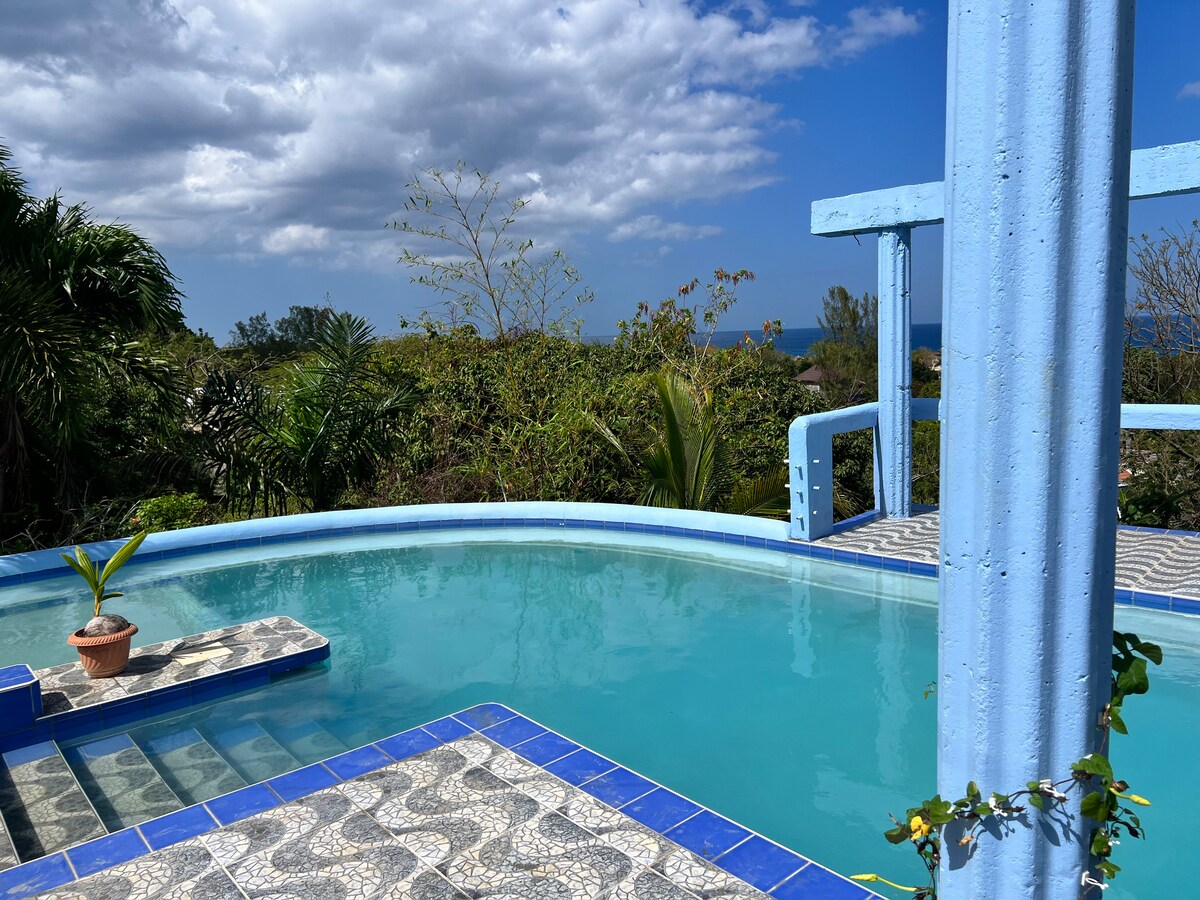 Wake up to sweeping views of the Caribbean Sea in this light & airy, spacious unit. Ideal for anyone needing inspiration to write, create, do yoga, or simply to breathe. This space features a living room with a TV & Amazon Fire Stick, a dining area, a full kitchen, a palatial bedroom with king size bed & A/C, & an open plan bathroom (with hot shower). Our sun-heated pool is steps from your front door, just past your private patio. You'll live eye level to the infamous "Best View in Negril".